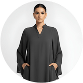 Elevate your wardrobe with this statement two-piece ensemble crafted from premium textured crepe. The black-teal tunic features a structured high collar and an asymmetrical draped hem that creates a graceful, flowy silhouette. Wide, turned-up cuffs add a contemporary edge, perfectly balancing sophistication with effortless...- Rs.4,099.00