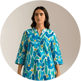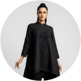 Elevate your wardrobe with this statement two-piece ensemble crafted from premium textured crepe. The black-teal tunic features a structured high collar and an asymmetrical draped hem that creates a graceful, flowy silhouette. Wide, turned-up cuffs add a contemporary edge, perfectly balancing sophistication with effortless...- Rs.3,799.00