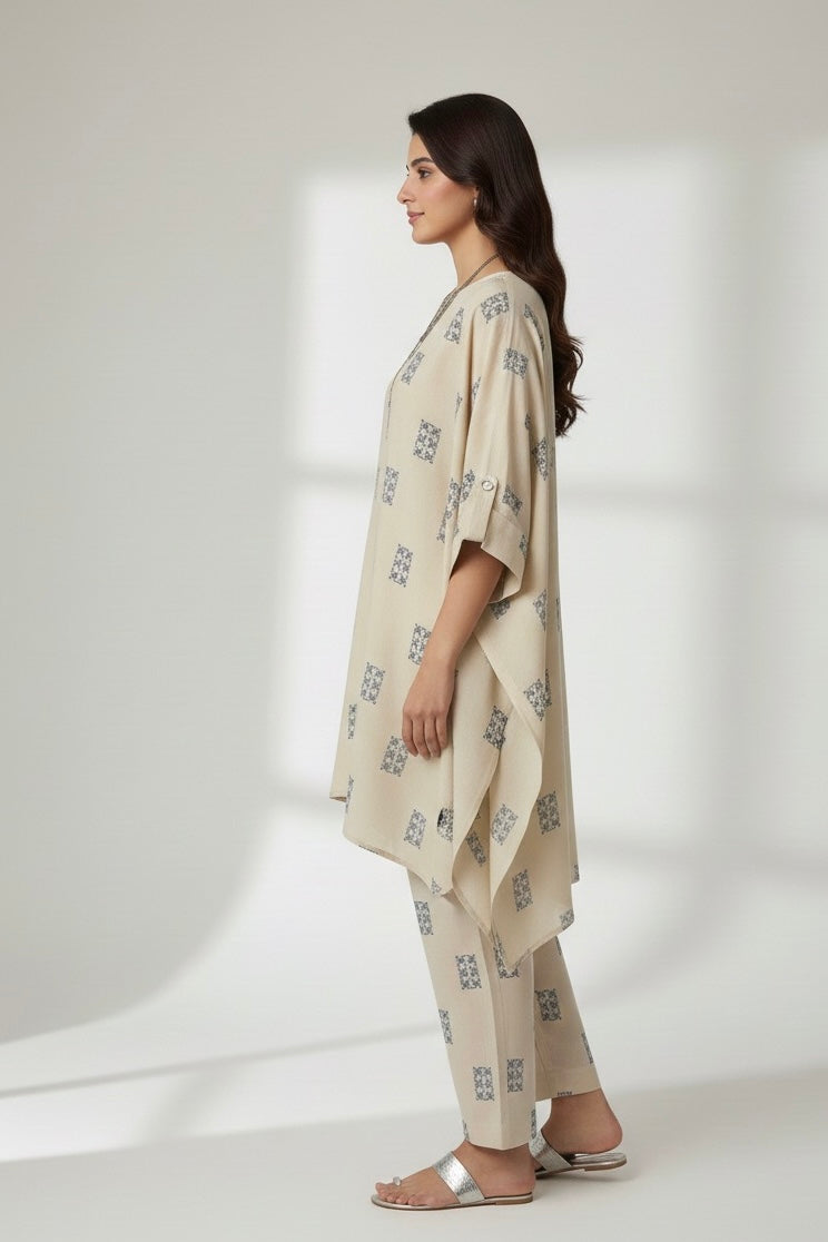 Designed for effortless elegance, this two-piece ensemble is crafted from breathable Arabic linen featuring a refined all-over print. The tunic showcases a relaxed, flowy silhouette with wide sleeves and an asymmetrical hem, offering graceful movement and a contemporary modest look.