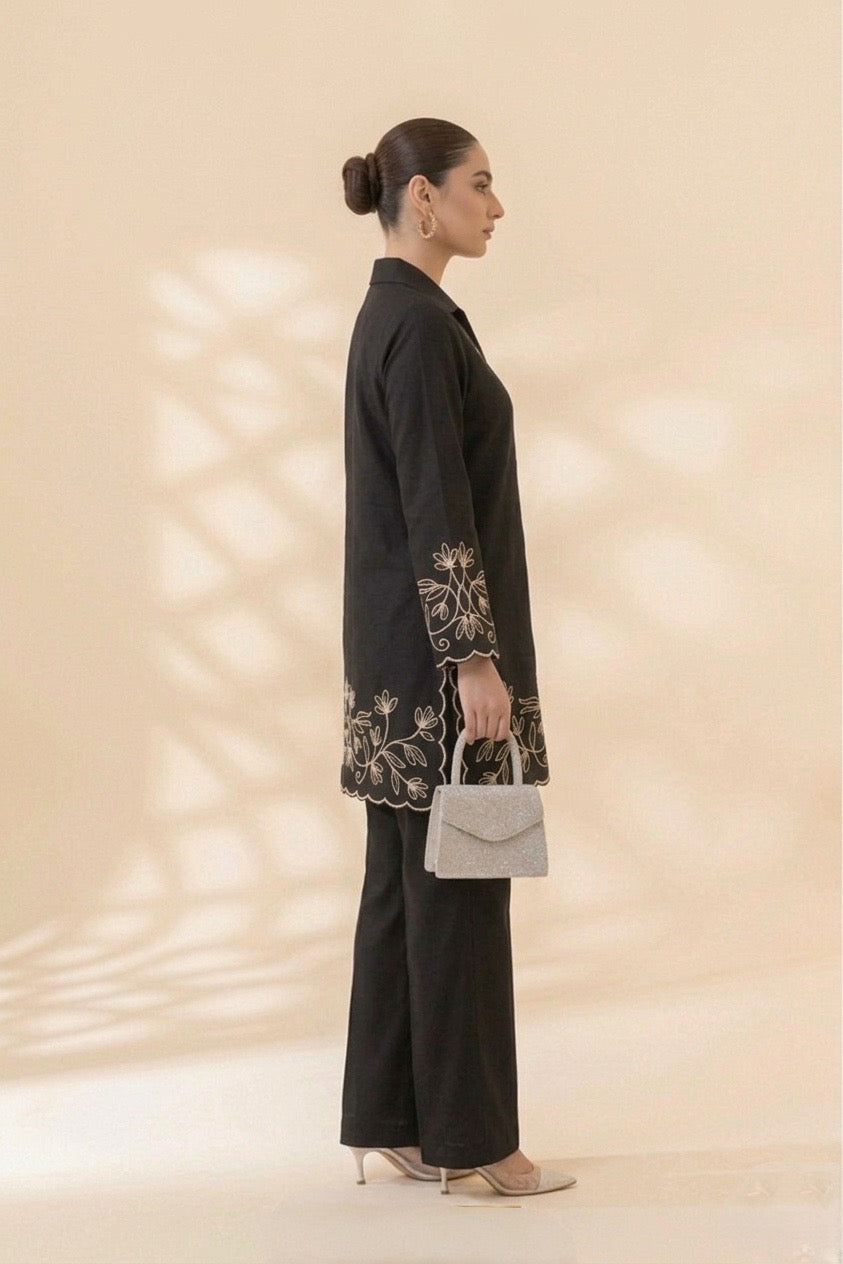 Step into effortless elegance with this beautifully crafted lavender co-ord set, designed to blend comfort with refined style. Featuring a soft pastel hue paired with delicate black floral embroidery, this outfit is perfect for both casual daywear and polished evening looks.