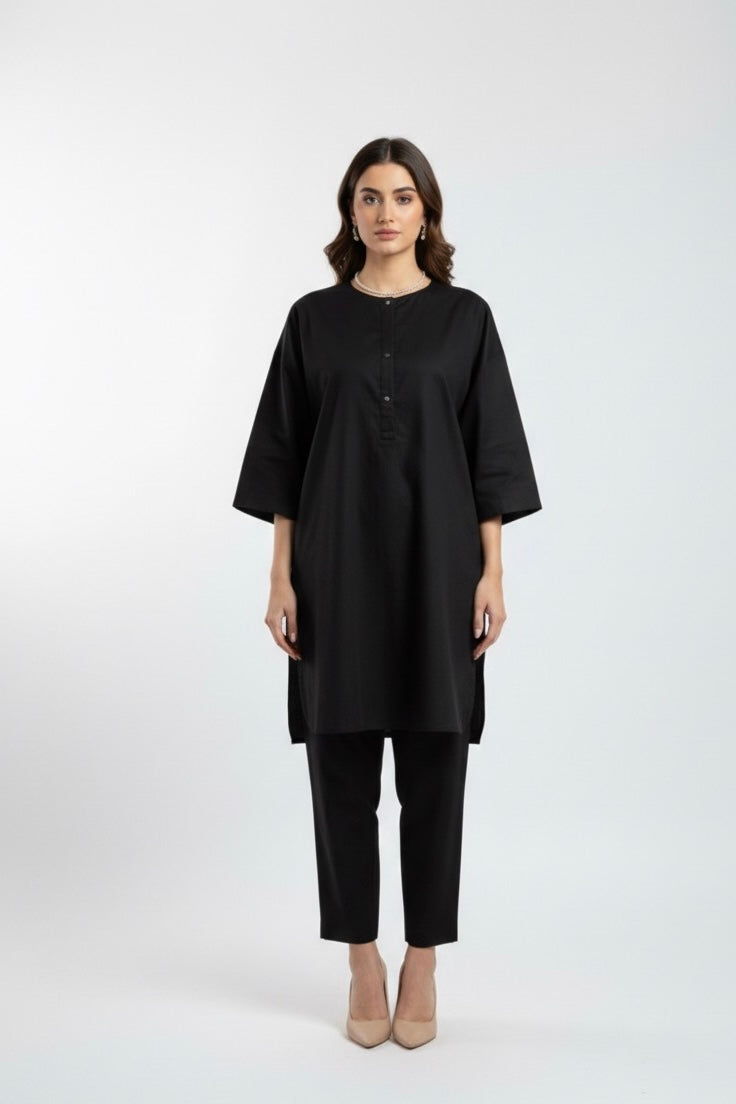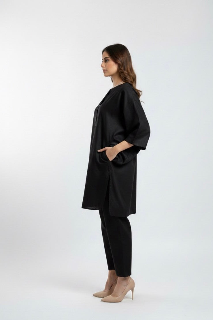 A refined everyday essential crafted in breathable cambric for effortless wear. This minimalist two-piece features a relaxed straight-cut shirt with a clean round neckline and subtle front button detailing, paired with tailored straight trousers for a polished yet comfortable look.