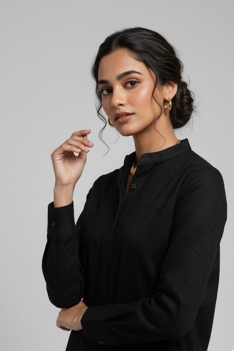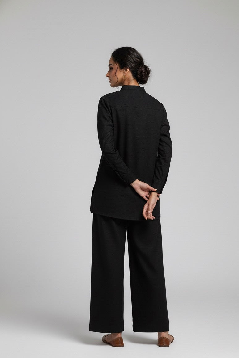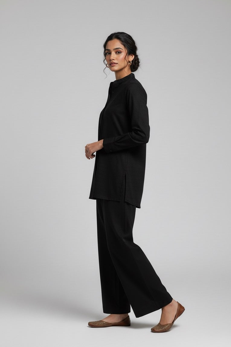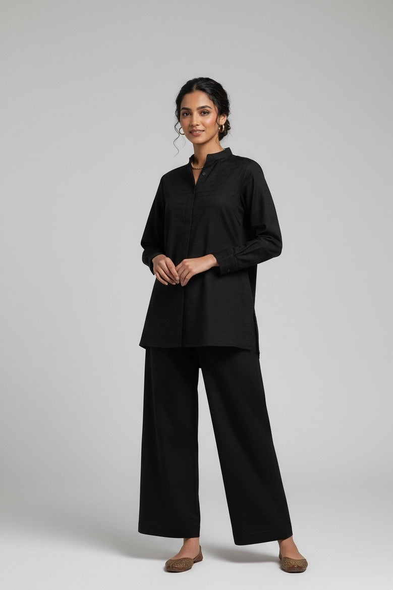 Elevate your winter wardrobe with this elegant two-piece cotton co-ord set, crafted in a rich black hue. The outfit features a relaxed straight-cut shirt with a band collar, concealed placket, and long sleeves, paired with wide-leg trousers for a chic, effortless silhouette.