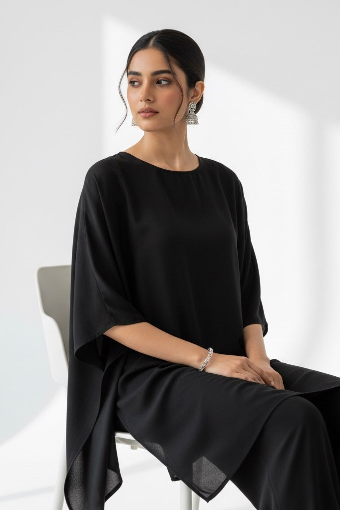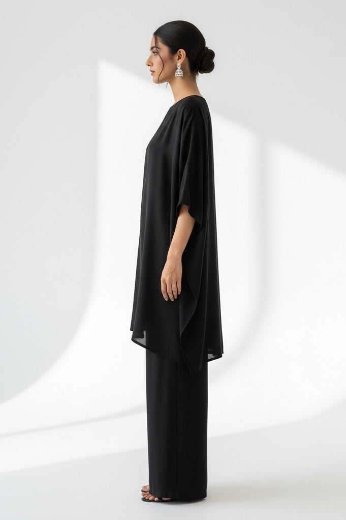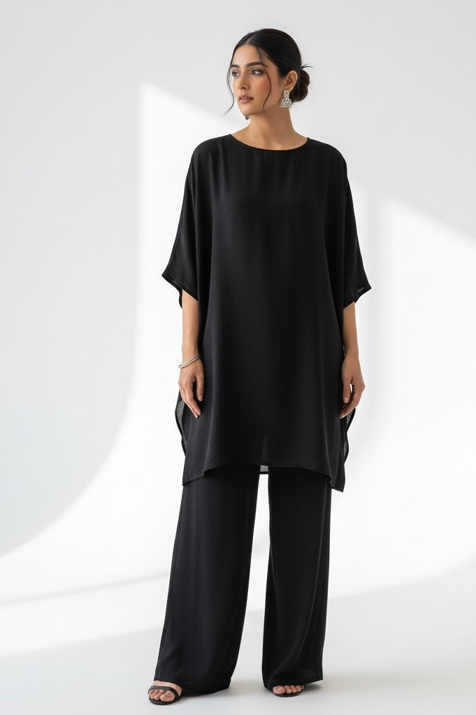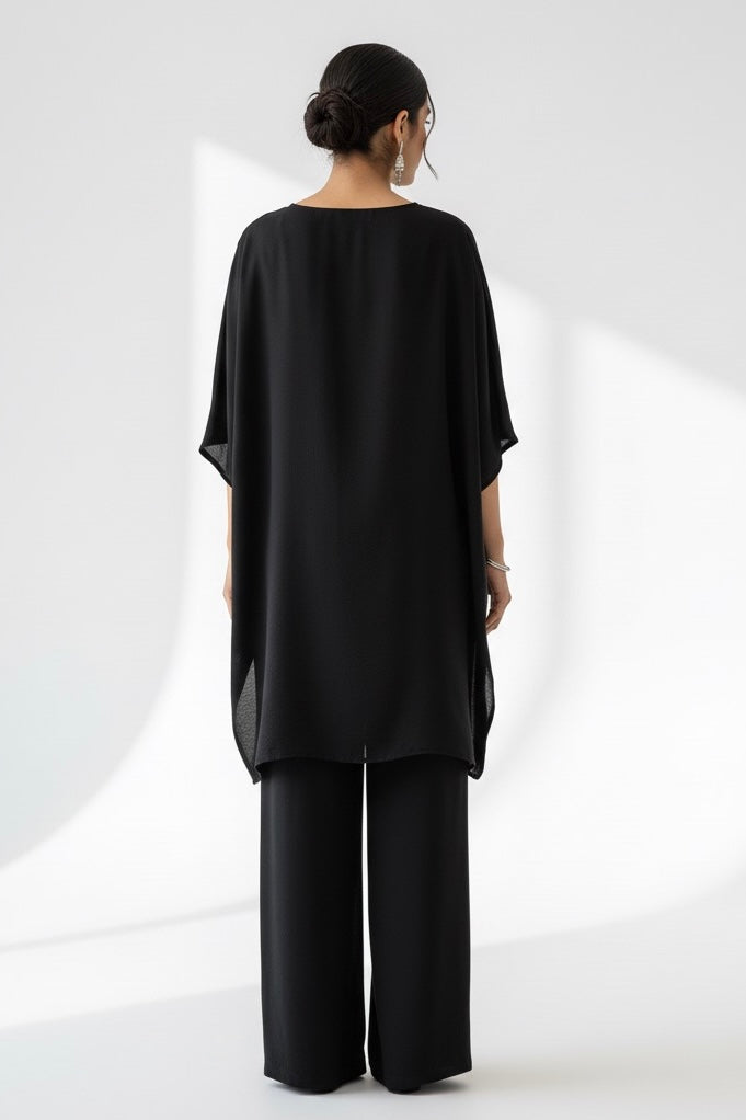Make a statement in timeless black. This coord set features a relaxed-fit georgette tunic paired with wide-leg trousers, offering both comfort and sophistication. The kaftan-style top drapes beautifully, while the sleek silhouette adds understated elegance — perfect for evening gatherings, dinners, or semi-formal events.