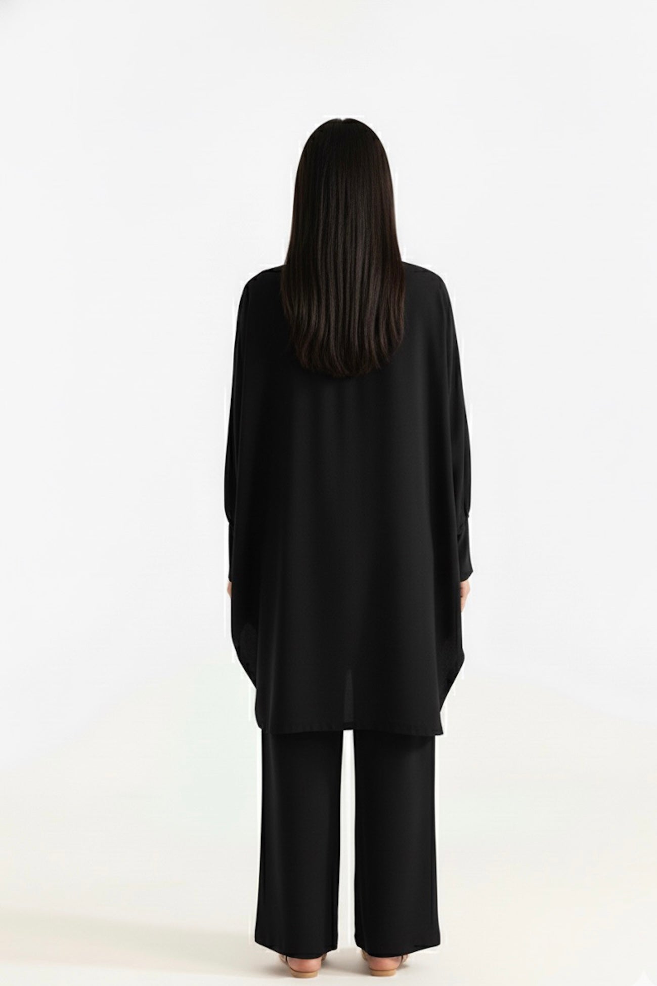 Made from a luxurious, breathable fabric, this set drapes beautifully, offering a flattering fit for all body types. The tunic boasts a subtle V-neckline and generous long sleeves, perfect for adding a touch of drama to your look. The trousers feature a comfortable elasticated waist and a flowing cut, ensuring ease of movement throughout your day.