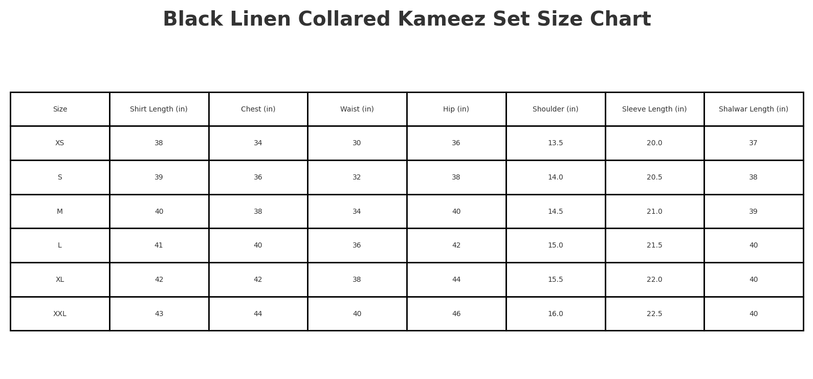 The kameez features black collared button down shirt trousers are shalwar style.