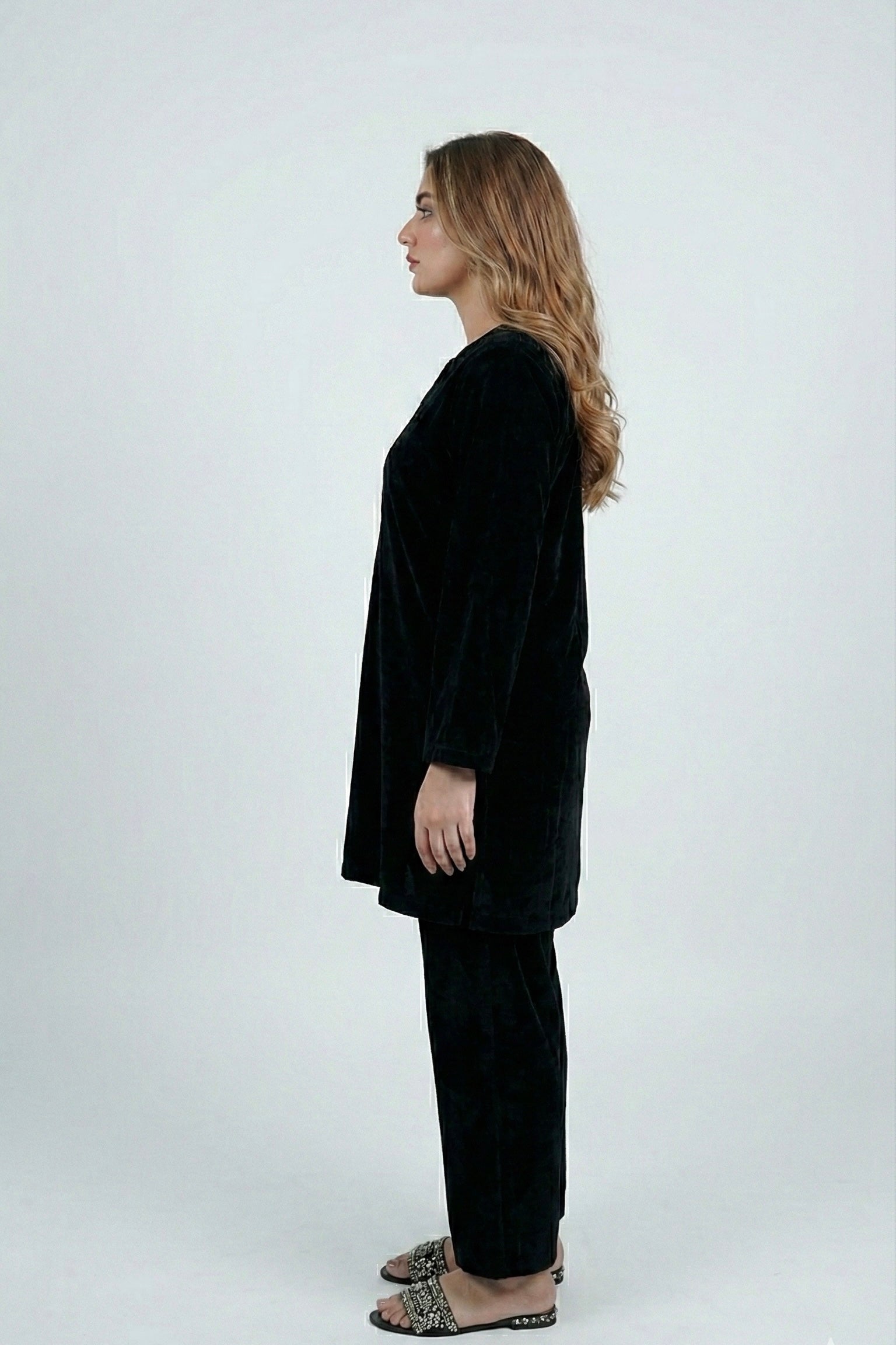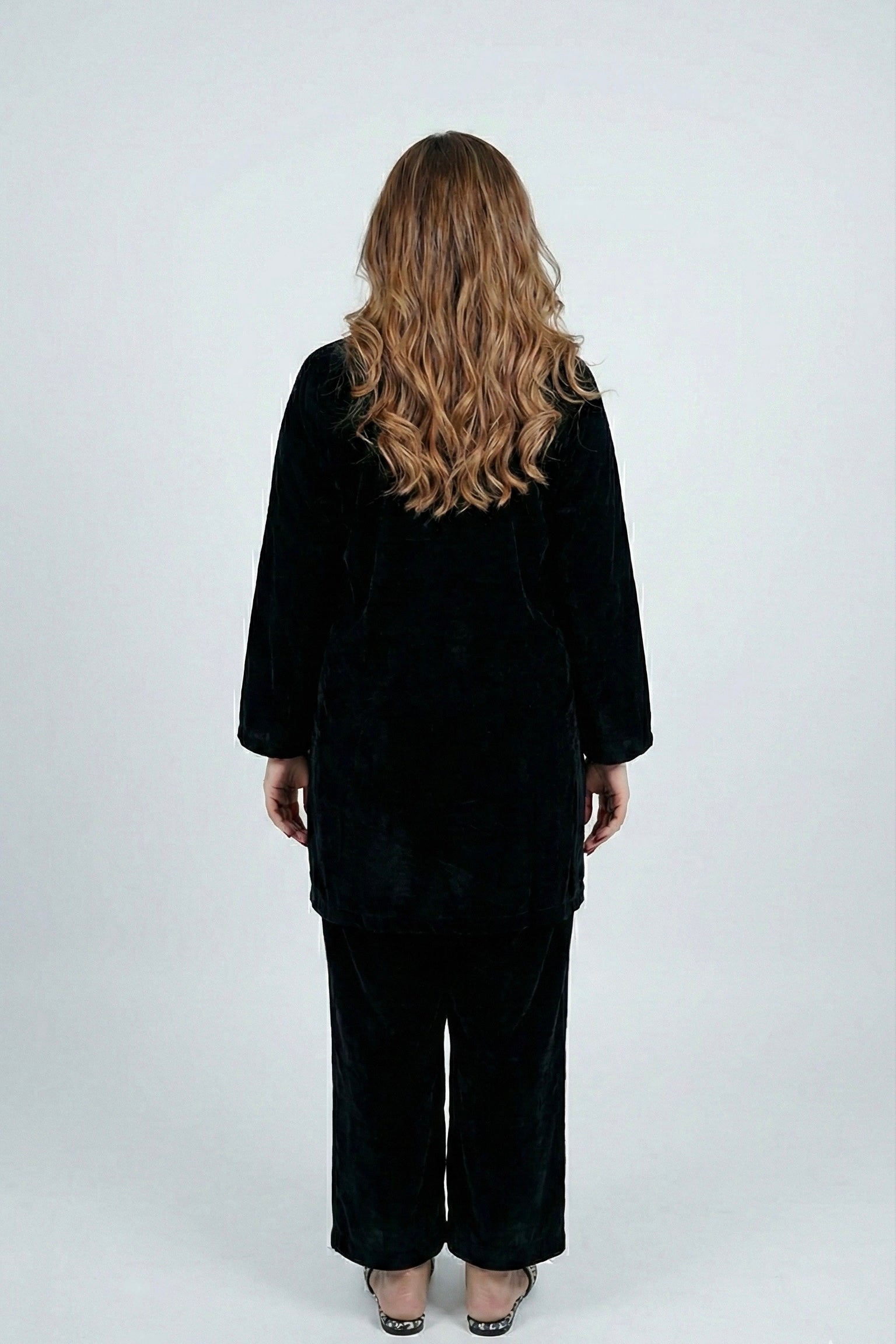A cosy-chic velvet co-ord designed for easy everyday elegance. The set features a relaxed, straight-cut long top with statement front buttons paired with matching straight trousers for a polished, put-together look with maximum comfort.