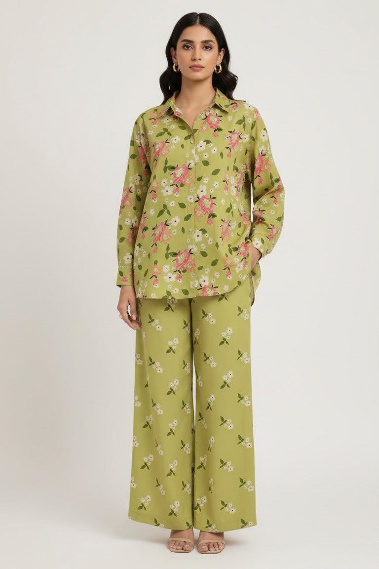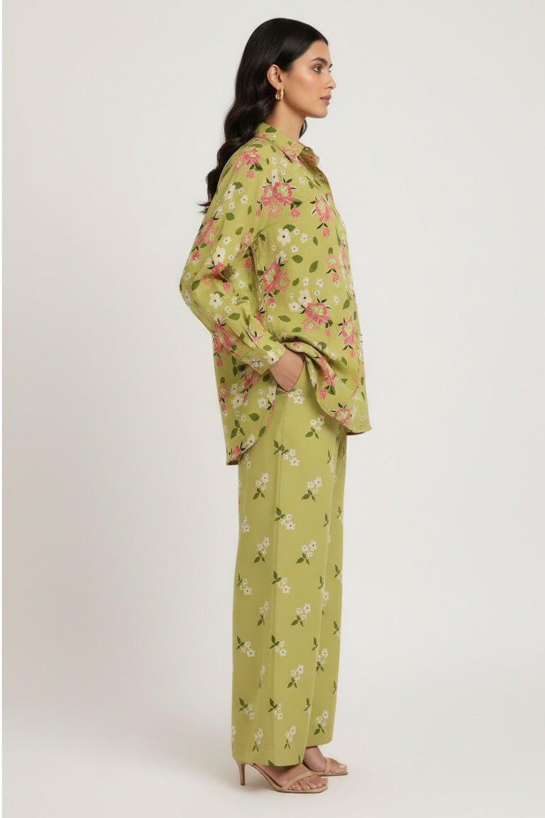 A chic and comfortable printed co-ord set featuring a soft olive-green base adorned with delicate floral patterns in pink and white. The top comes in a relaxed, button-down silhouette with full sleeves, shirt collar, and a flowy drape that ensures ease and elegance. Paired with wide-leg trousers featuring matching floral motifs for a coordinated yet balanced look.
