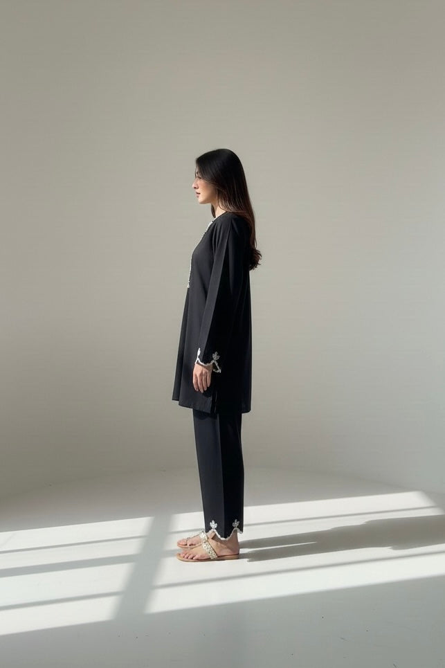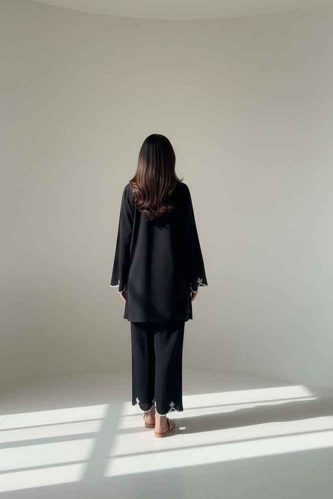 Timeless and effortlessly elegant, this two-piece ensemble is crafted from breathable premium cambric in a classic black hue. The tunic features a relaxed straight silhouette, elevated with delicate scalloped lace detailing along the hem and sleeve cuffs — adding subtle contrast and refined charm to its minimalist design.