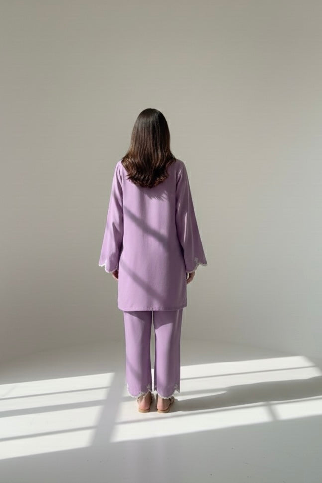 Soft, graceful, and effortlessly refined — this two-piece ensemble is crafted from breathable premium cambric in a delicate lilac hue. The tunic features a relaxed straight silhouette, elevated with subtle scalloped lace detailing along the hem and sleeve cuffs, adding a feminine finish to its minimalist design.