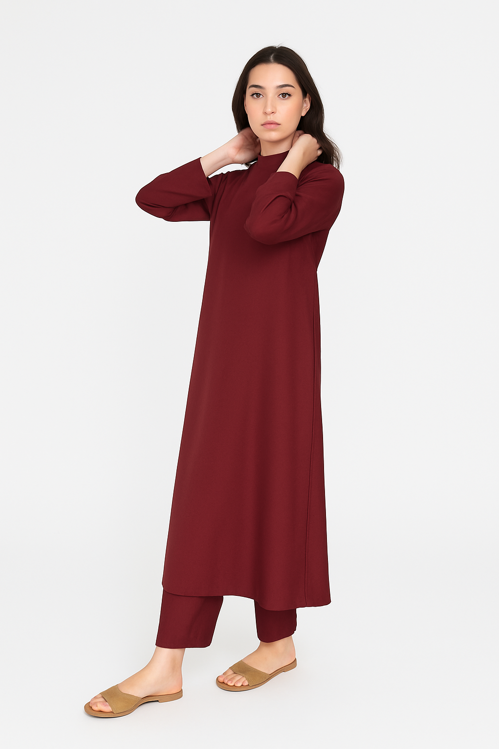 Effortlessly elegant and timeless, this burgundy long dress set is crafted for the modern woman who values comfort without compromising on style. Designed in a rich, deep shade of burgundy, the dress features a sleek straight cut with full sleeves and a modest neckline, paired with matching trousers for a refined, coordinated look.