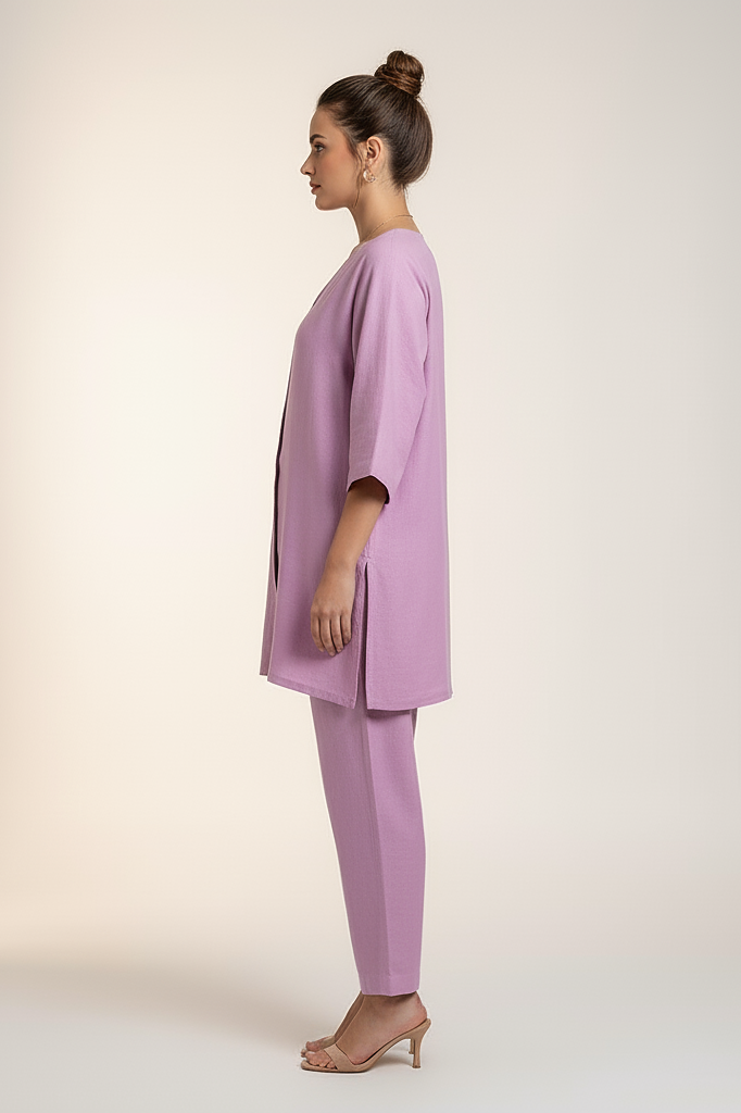 Elevate your everyday look with this vibrant lavendar two-piece coord set crafted from premium self-textured linen. The fabric’s subtle comb-weave gives a soft, graceful drape while maintaining a breathable and comfortable feel — perfect for year-round wear.