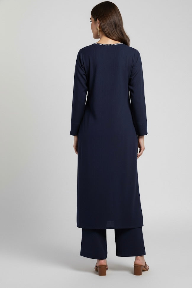 Effortlessly elegant — this deep navy two-piece set is crafted from premium stripe viscose fabric, known for its soft drape, breathable comfort, and subtle textured finish. The straight-cut shirt features a delicate pearl-trimmed neckline, long sleeves, and convenient side pockets for a modern touch.