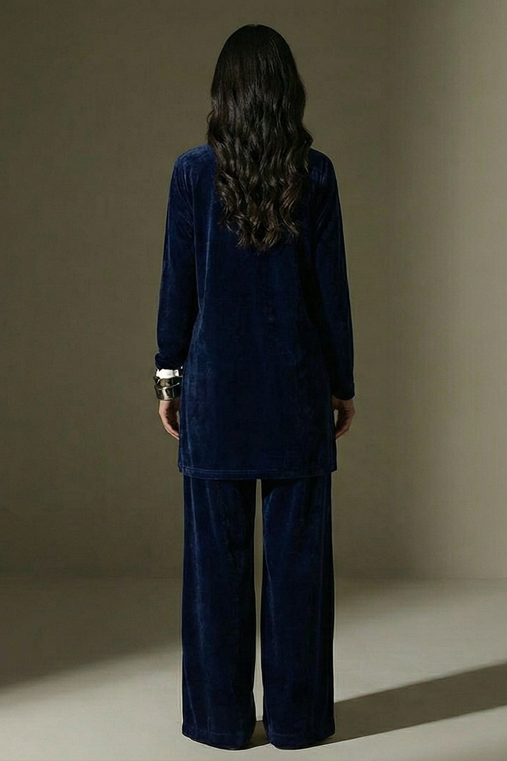 Elevate your winter evenings with this stunning navy velvet coord set — a perfect blend of luxury, comfort and graceful minimalism. Crafted from premium soft-pile velvet, the outfit drapes beautifully, offering a rich sheen and an ultra-comfortable feel for every occasion.