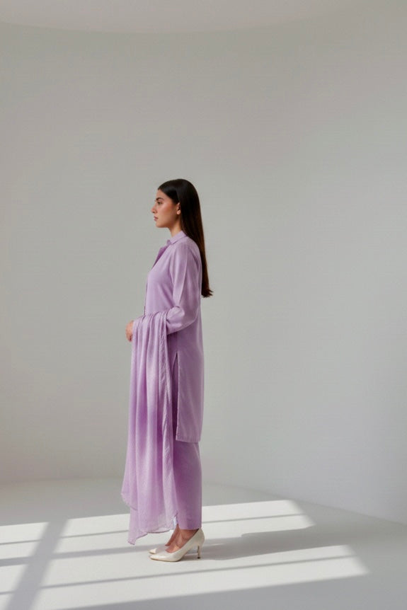Soft and refined, this three-piece ensemble is crafted from breathable dobby cambric in a warm peach hue. The shirt features a clean straight silhouette with a classic collared neckline and front button detailing, elevated by the subtle woven texture that adds depth while maintaining a minimalist appeal.