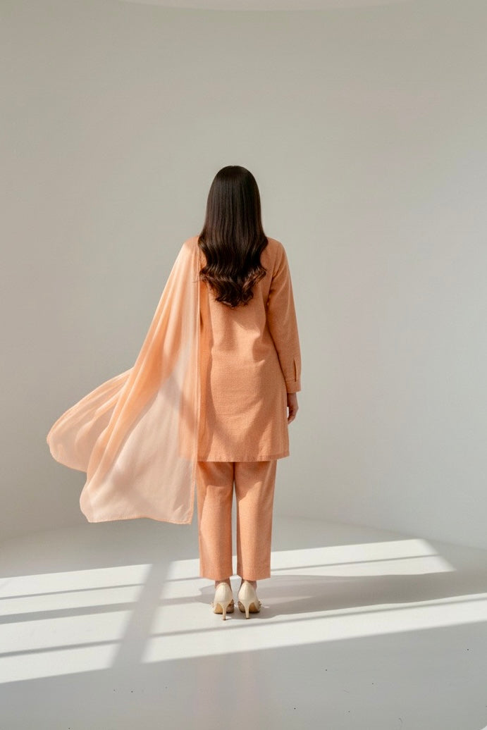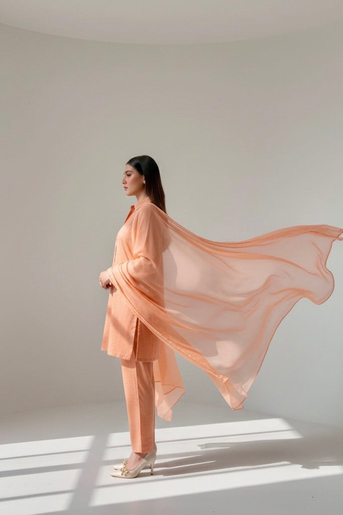 Soft and refined, this three-piece ensemble is crafted from breathable dobby cambric in a warm peach hue. The shirt features a clean straight silhouette with a classic collared neckline and front button detailing, elevated by the subtle woven texture that adds depth while maintaining a minimalist appeal.