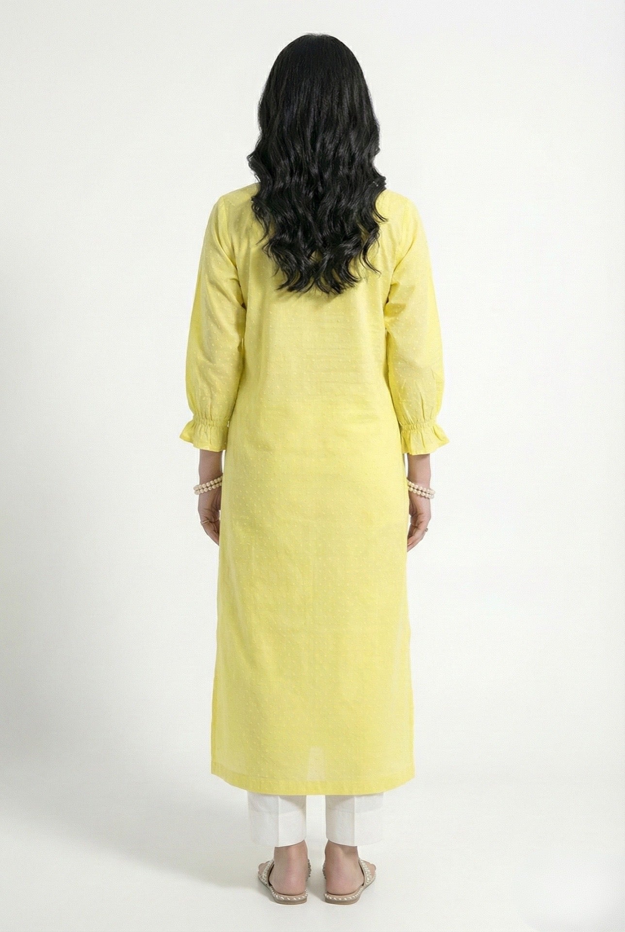 Effortlessly elegant and endlessly wearable, this two-piece lawn set is designed for modern everyday dressing. Crafted from lightweight, breathable lawn fabric, the ensemble features a relaxed straight-cut top with a subtle neckline slit and delicate sleeve tie details, paired with wide-leg trousers for a fluid, flattering silhouette.