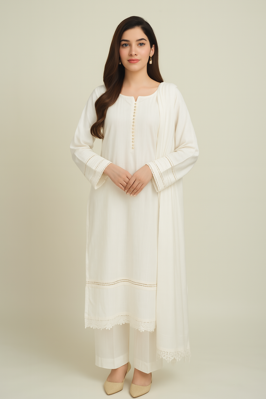 Elevate your everyday elegance with this stunning off-white cotton ensemble. Featuring a long-length straight kurta with intricate lace detailing on the sleeves and hemline, paired with a wide-leg trouser and a matching soft dupatta, this outfit blends tradition with a modern minimal aesthetic.