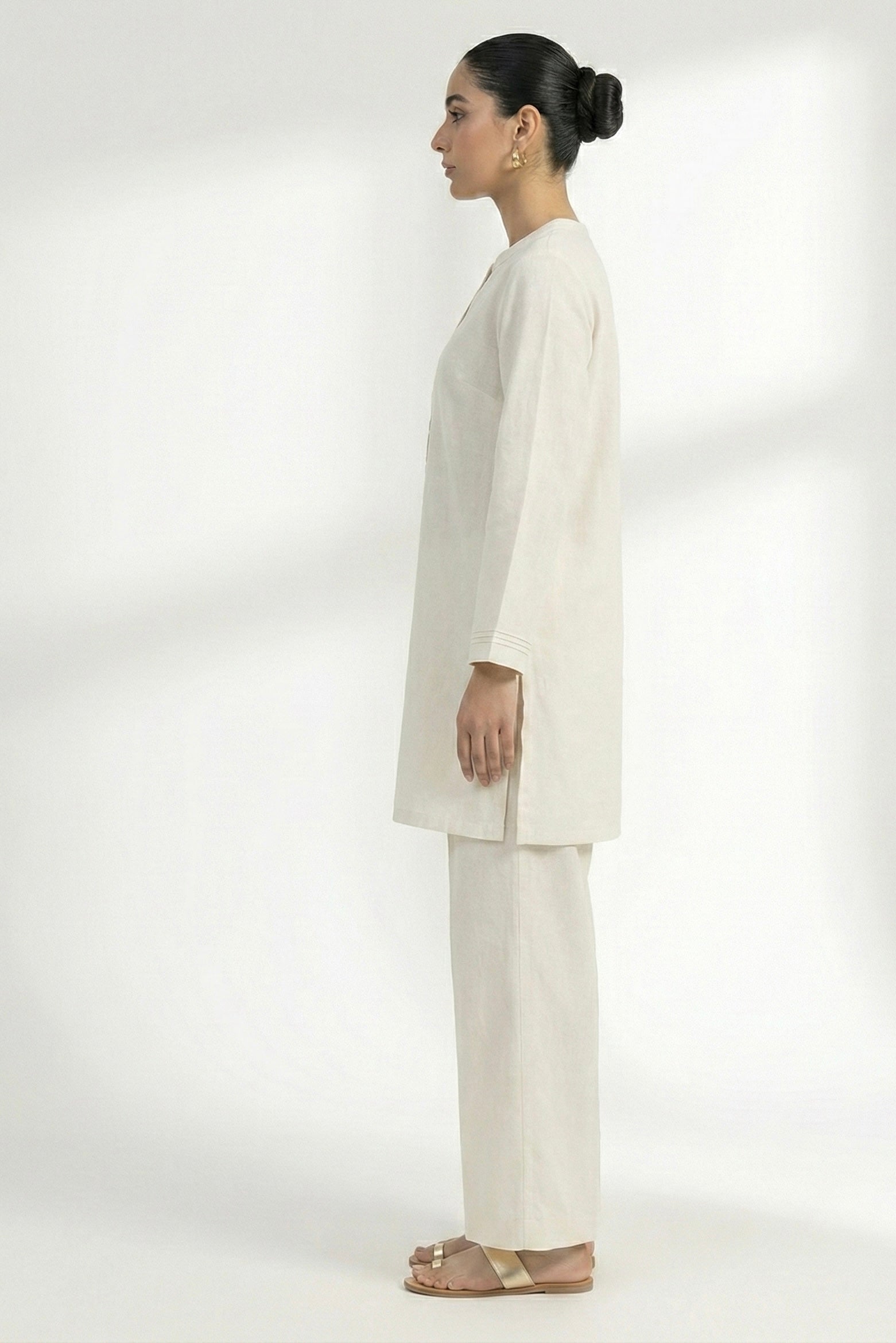 A refined everyday co-ord crafted from breathable dobby lawn cotton, designed for effortless elegance and comfort. The set features a relaxed straight-cut tunic with a minimal button placket and wide sleeves, paired with matching wide-leg trousers for a clean, modern silhouette. Ideal for summer wear, casual outings, and elevated daily dressing.