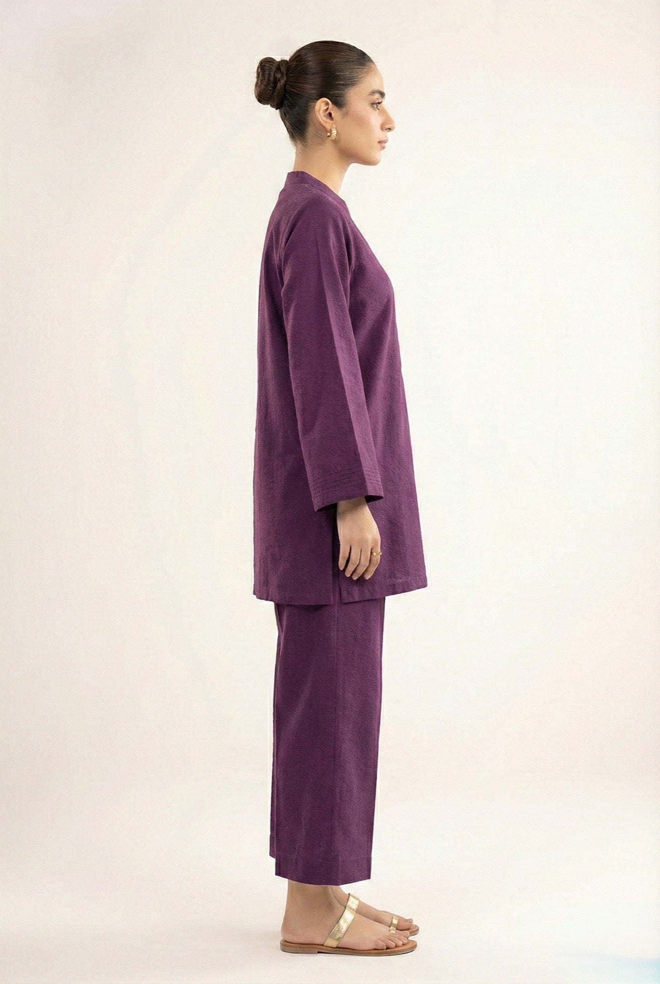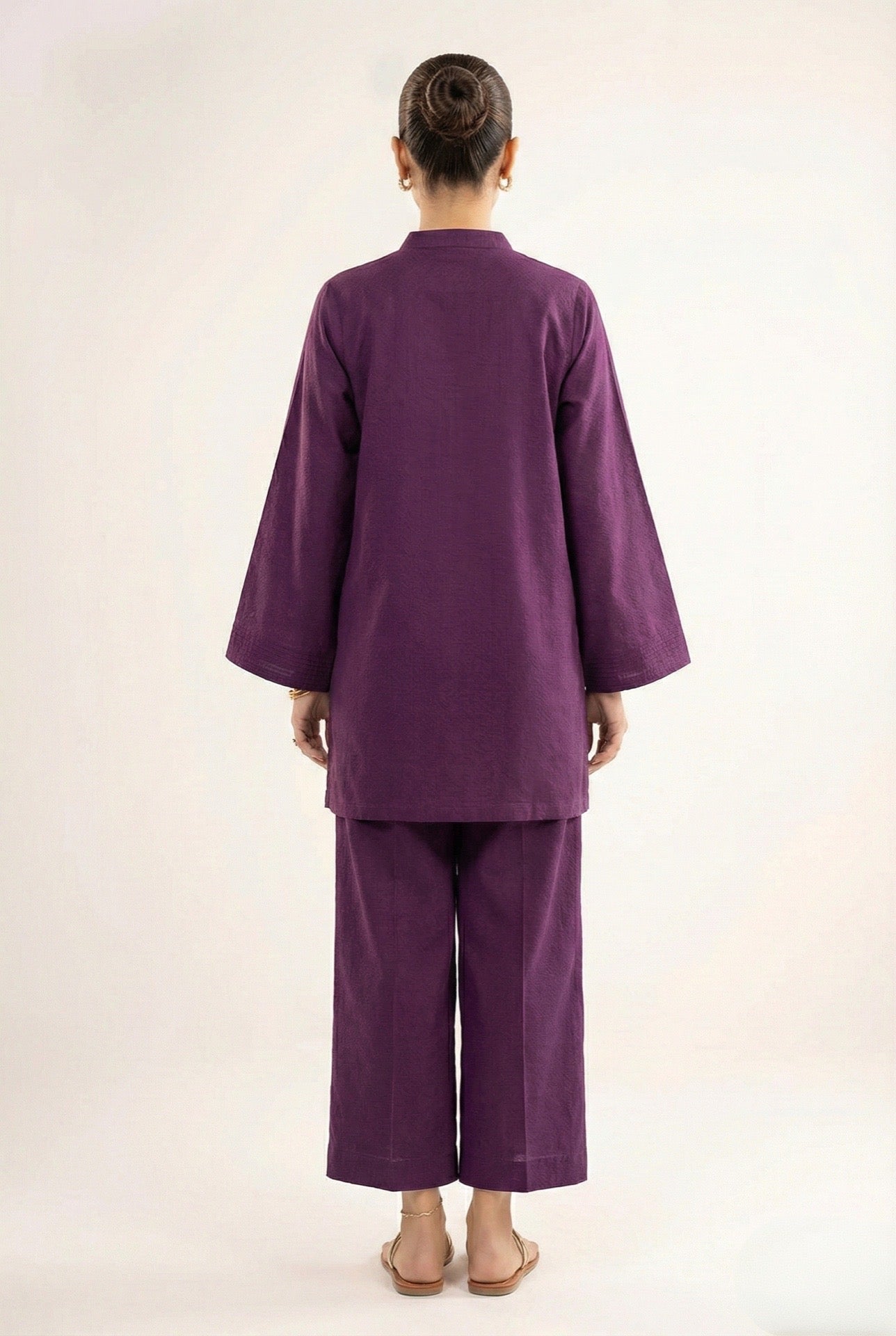 A refined everyday co-ord crafted from breathable dobby lawn cotton, designed for effortless elegance and comfort. The set features a relaxed straight-cut tunic with a minimal button placket and wide sleeves, paired with matching wide-leg trousers for a clean, modern silhouette. Ideal for summer wear, casual outings, and elevated daily dressing.