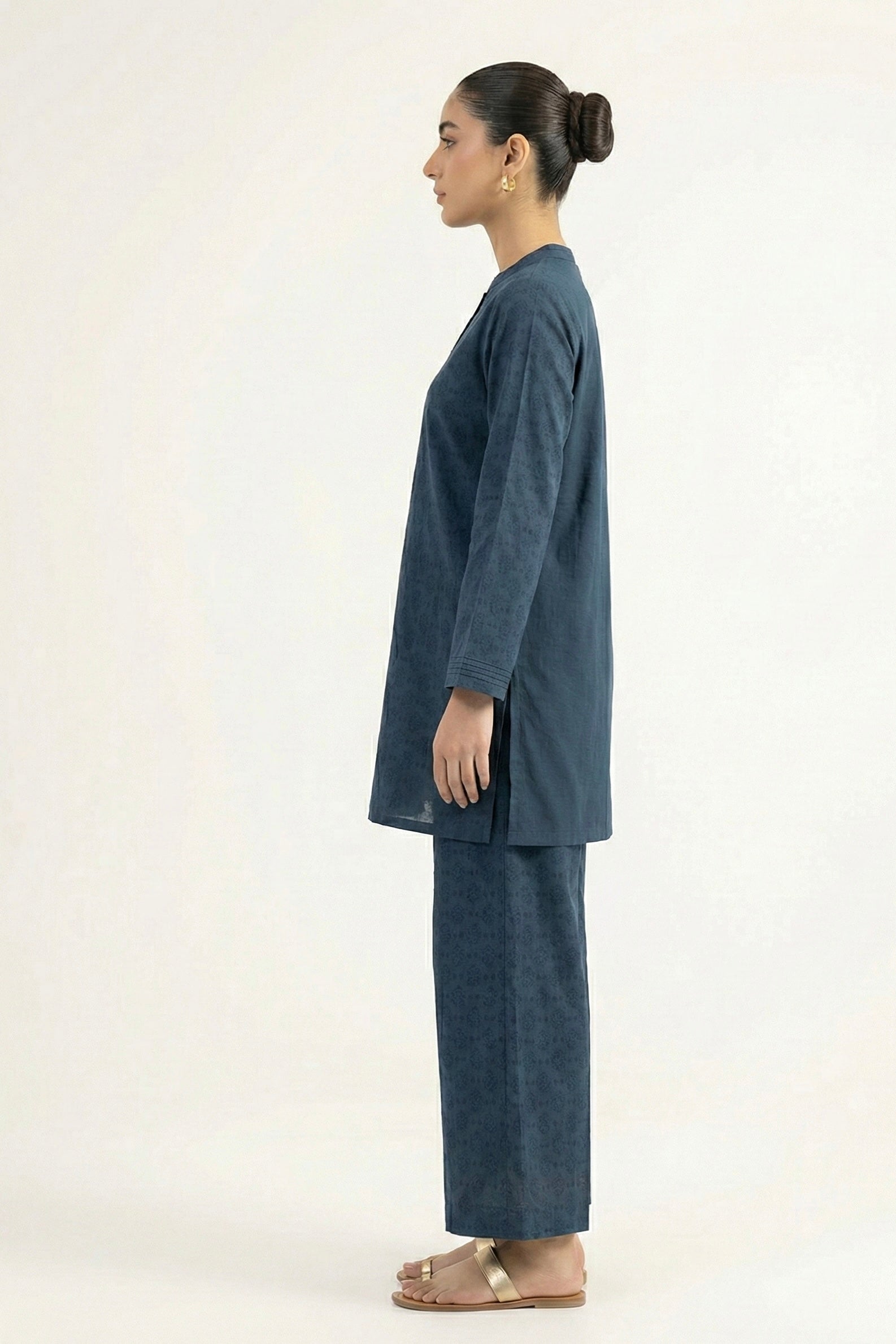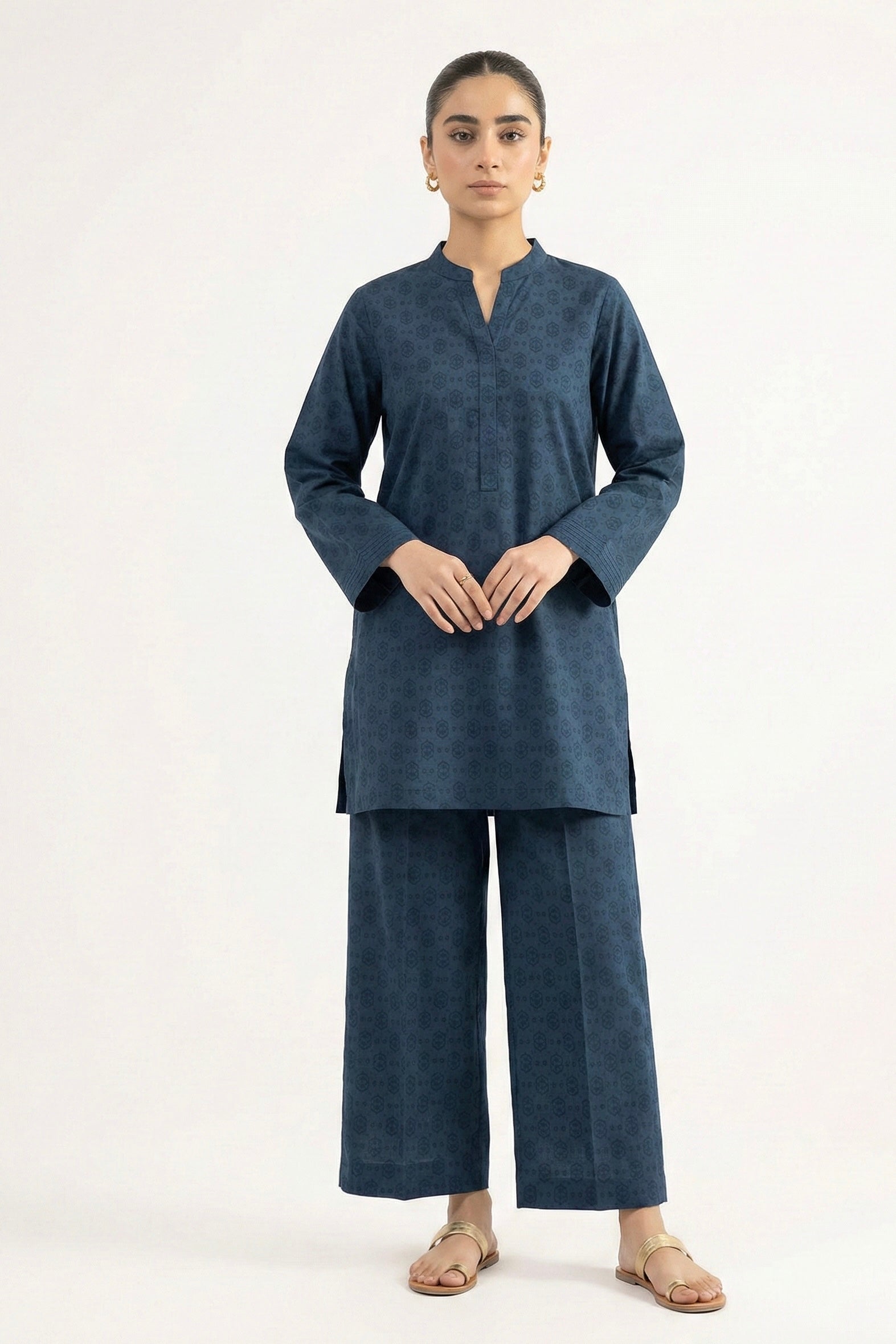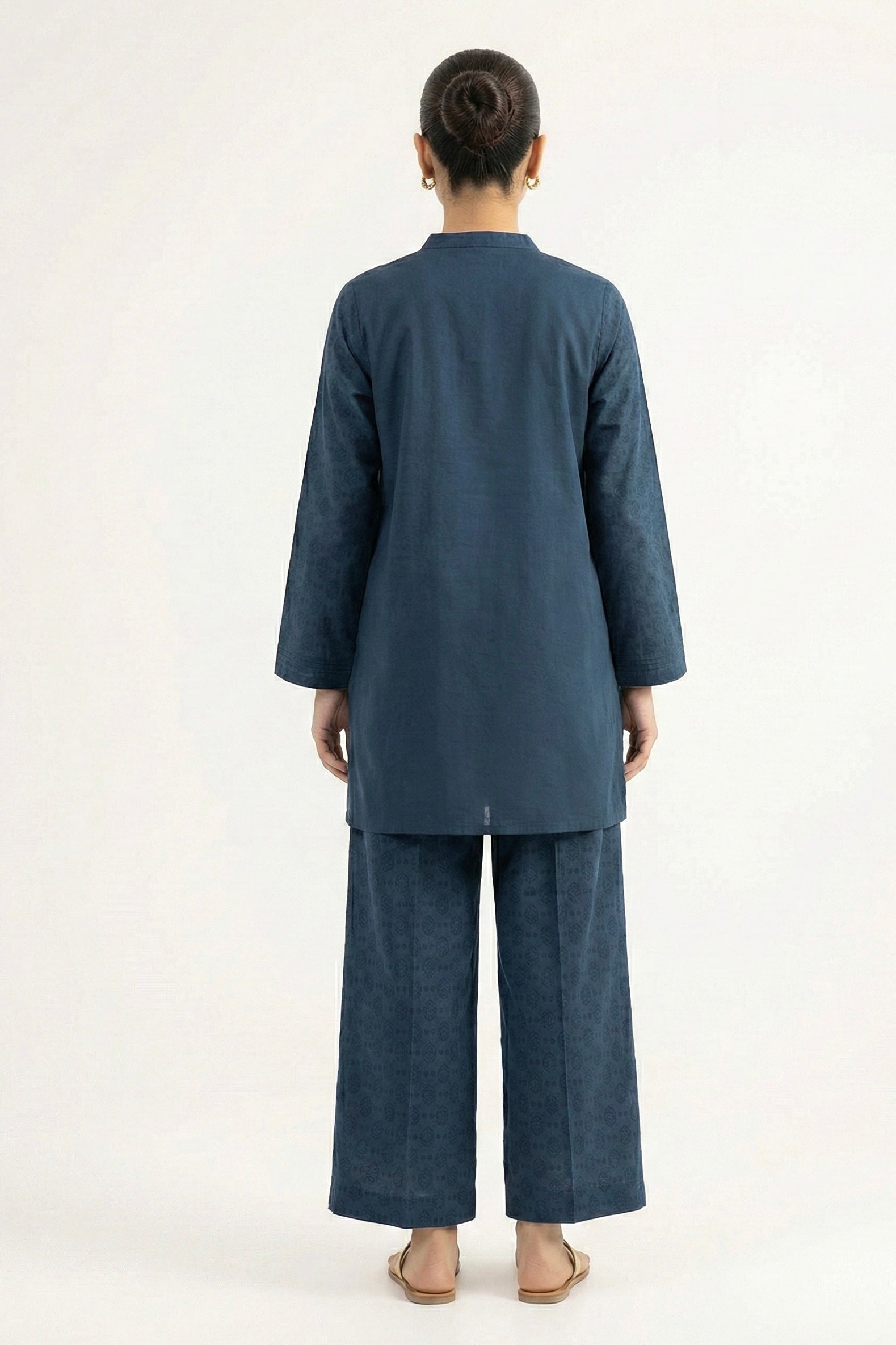 A refined everyday co-ord crafted from breathable dobby lawn cotton, designed for effortless elegance and comfort. The set features a relaxed straight-cut tunic with a minimal button placket and wide sleeves, paired with matching wide-leg trousers for a clean, modern silhouette. Ideal for summer wear, casual outings, and elevated daily dressing.