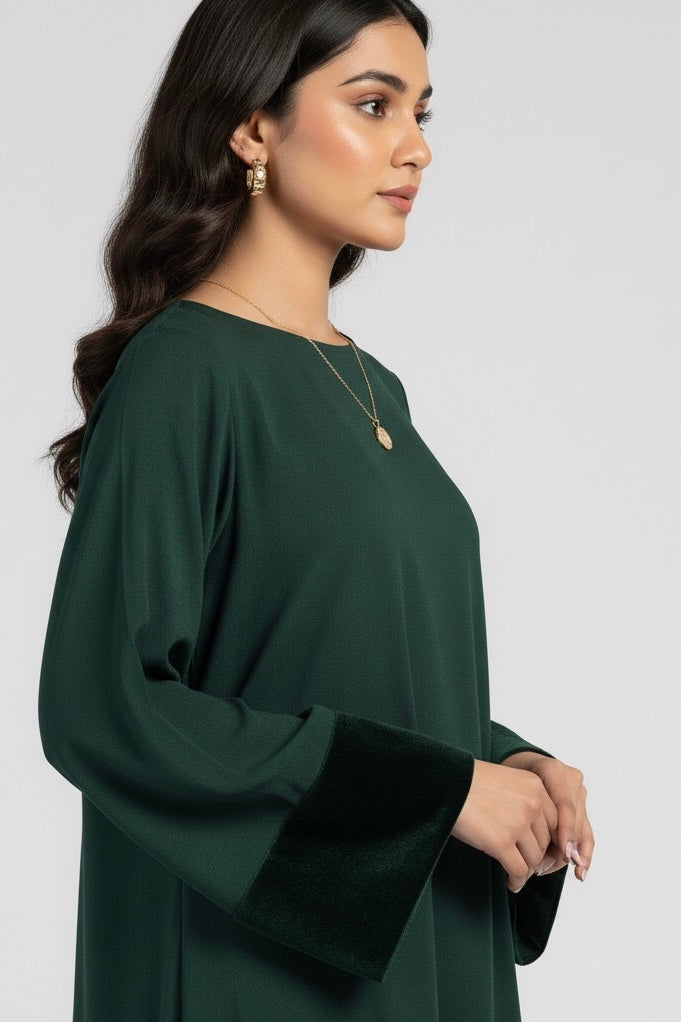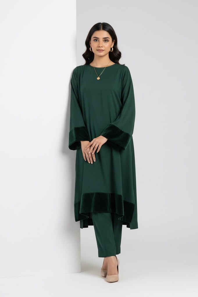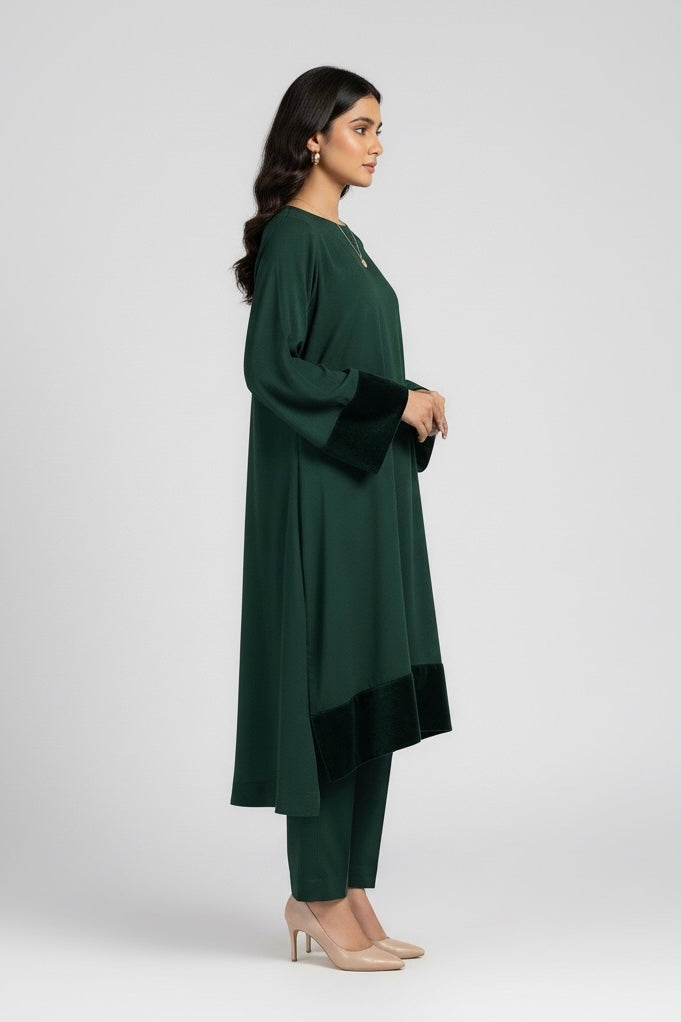 Step into effortless elegance with our Karandi Chic - Emerald Velvet Accent Coord Set. Designed for the modern Pakistani woman, this stylish and comfortable ensemble perfectly blends traditional fabric with contemporary design for a slightly shorter, on-trend silhouette.