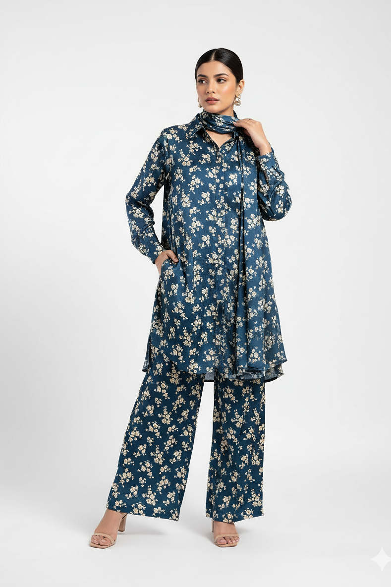 Elevate your wardrobe with this stunning three-piece co-ord set crafted from luxe charmeuse silk. Featuring a relaxed A-line kurta with a button-down front, side pockets, and a breezy silhouette, it pairs effortlessly with wide-leg trousers for all-day comfort. The outfit is adorned with a delicate all-over floral print, lending it a fresh and elegant vibe. A matching lightweight scarf completes the look, perfect for both casual chic and semi-formal wear.