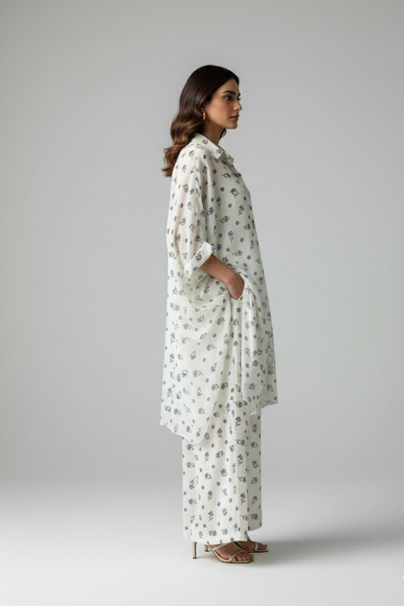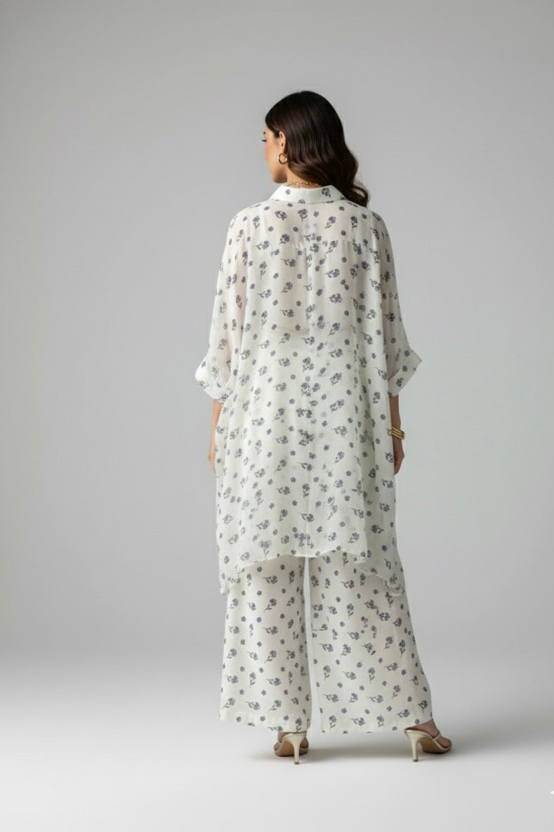 Step into effortless elegance with this chic two-piece co-ord set crafted from airy georgette. The design features a relaxed silhouette with a button-down front and a draped kaftan-style overlay for a modern yet graceful look. Its soothing ivory base is adorned with delicate blue floral motifs, giving it a timeless appeal perfect for brunches, semi-formal gatherings, or relaxed evenings out.
