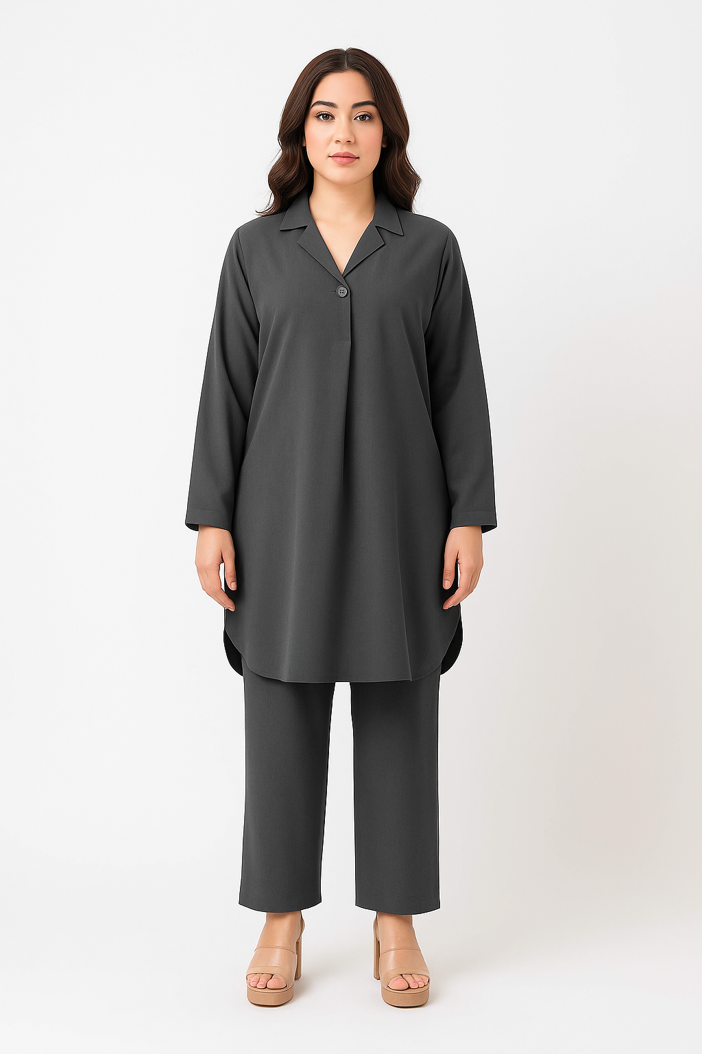 Grey georgette coord set with brown button collared shirt and plazo style pants.