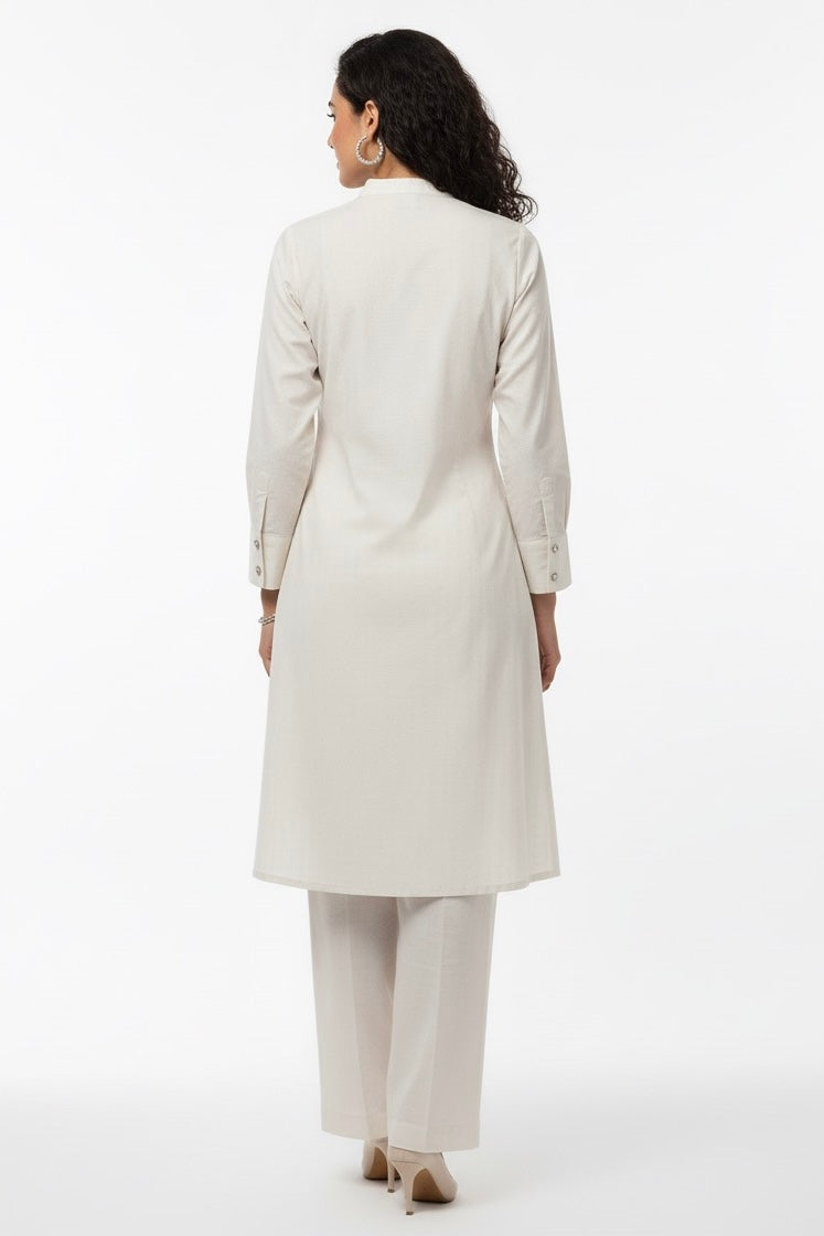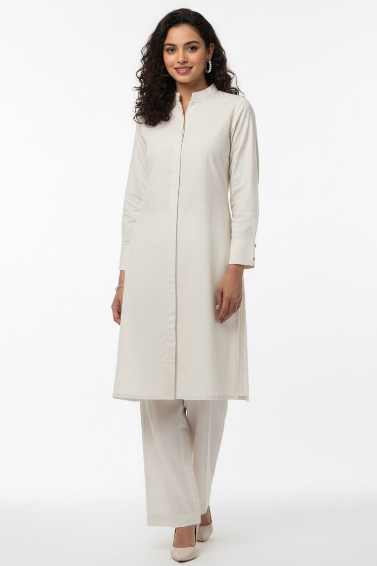 Elevate your winter style with our Ivory Minimal Kurta Set, crafted from premium winter cotton for a soft, breathable, and comfortable feel. This timeless ensemble features a straight-cut kurta with a band collar, concealed button placket, and full sleeves detailed with sleek cuffs. Paired with matching straight trousers, it offers a clean, graceful silhouette perfect for both casual gatherings and formal wear.
