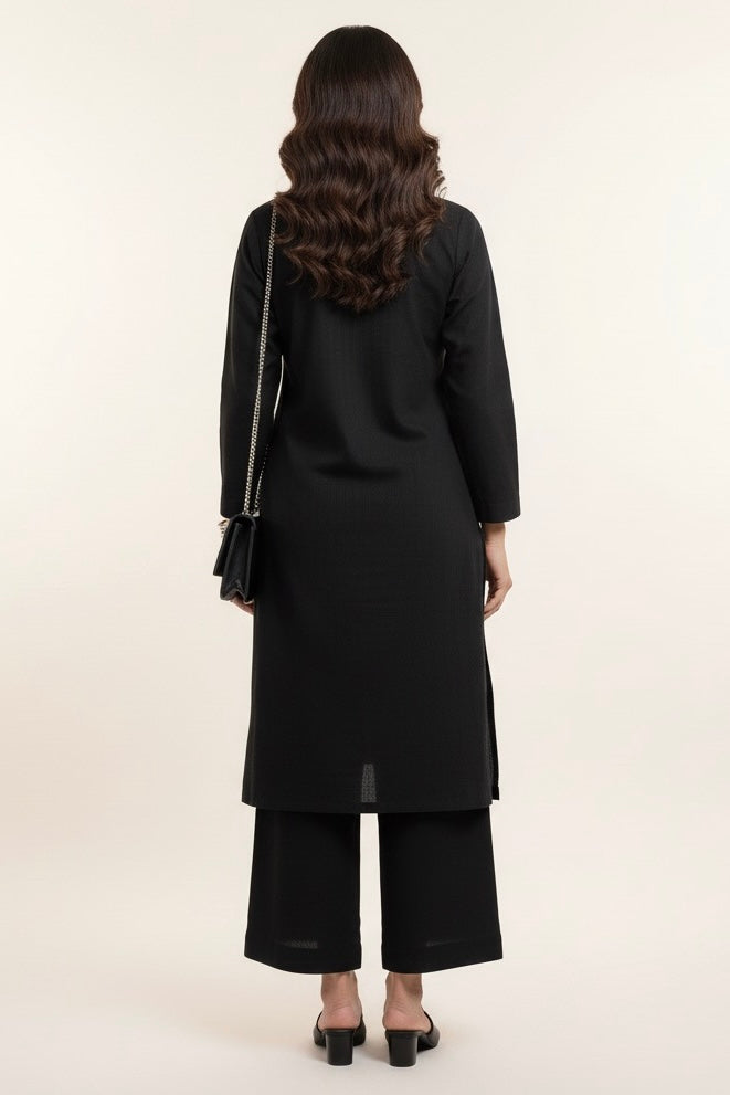Effortless elegance meets timeless comfort in this all-black two-piece outfit. Crafted from premium slub khaddar, this ensemble features a straight kurta with a smart V-slit neckline and full sleeves, paired with wide-leg culottes for a relaxed yet sophisticated silhouette.