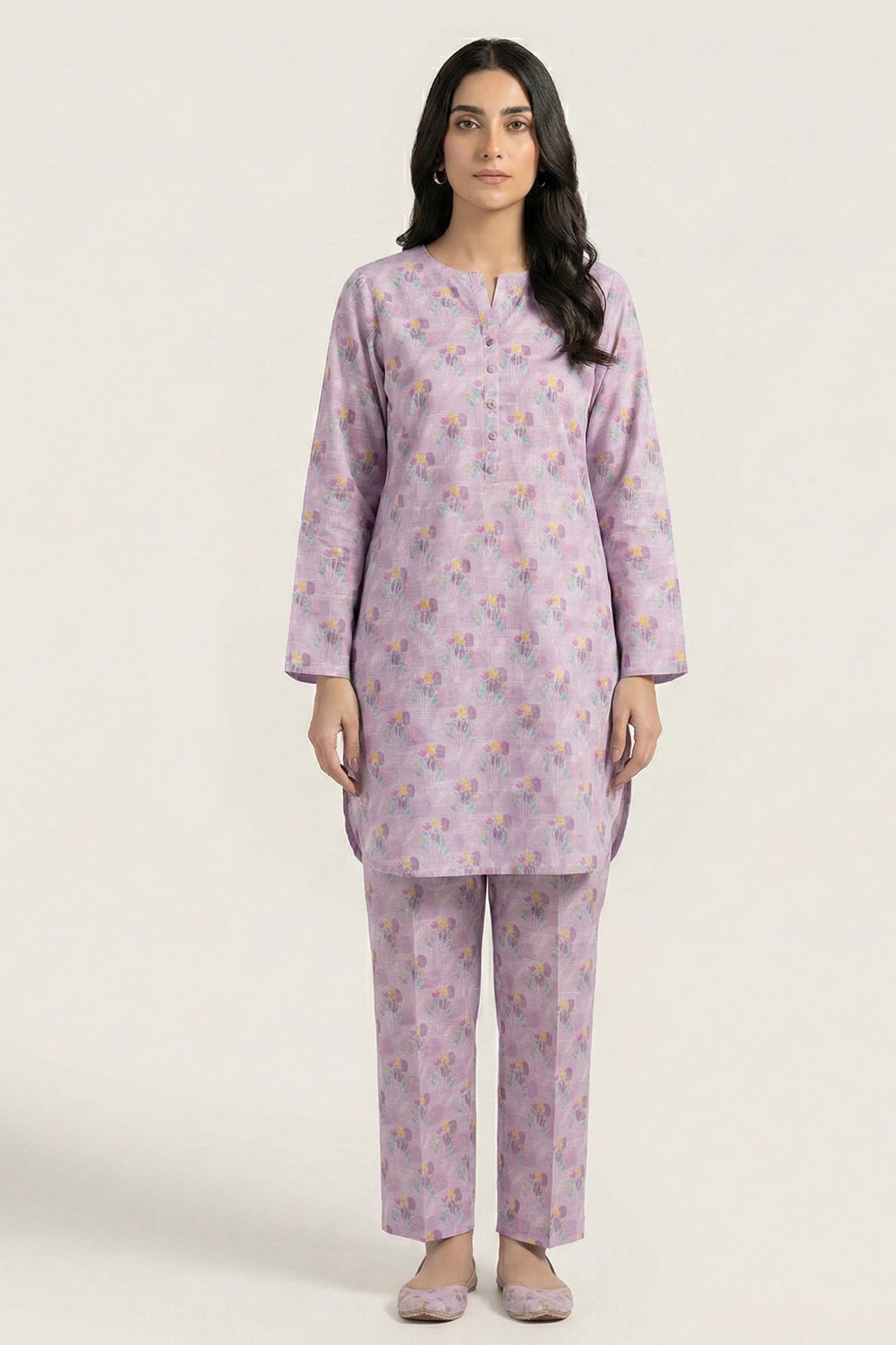 Crafted from breathable slub khaddar, this printed suit offers a perfect balance of comfort and everyday elegance. The soft textured weave adds natural depth to the fabric, making it ideal for cooler days while remaining easy to wear. Featuring a straight-cut shirt paired with matching trousers, this set is designed for effortless daily styling.