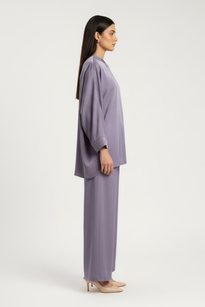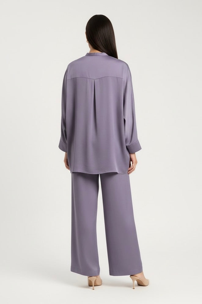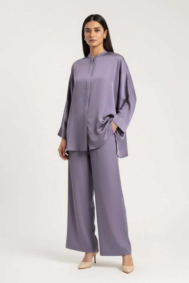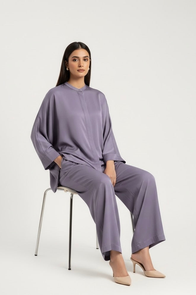 Effortless style meets all-day comfort in this chic Lavendar co-ord set. Crafted from premium blend fabric, the ensemble features a relaxed-fit top with a sleek V-neckline and wide sleeves for a breezy, modern look. Paired with flowy wide-leg trousers, it offers both versatility and elegance – perfect for casual outings, workdays, or travel.