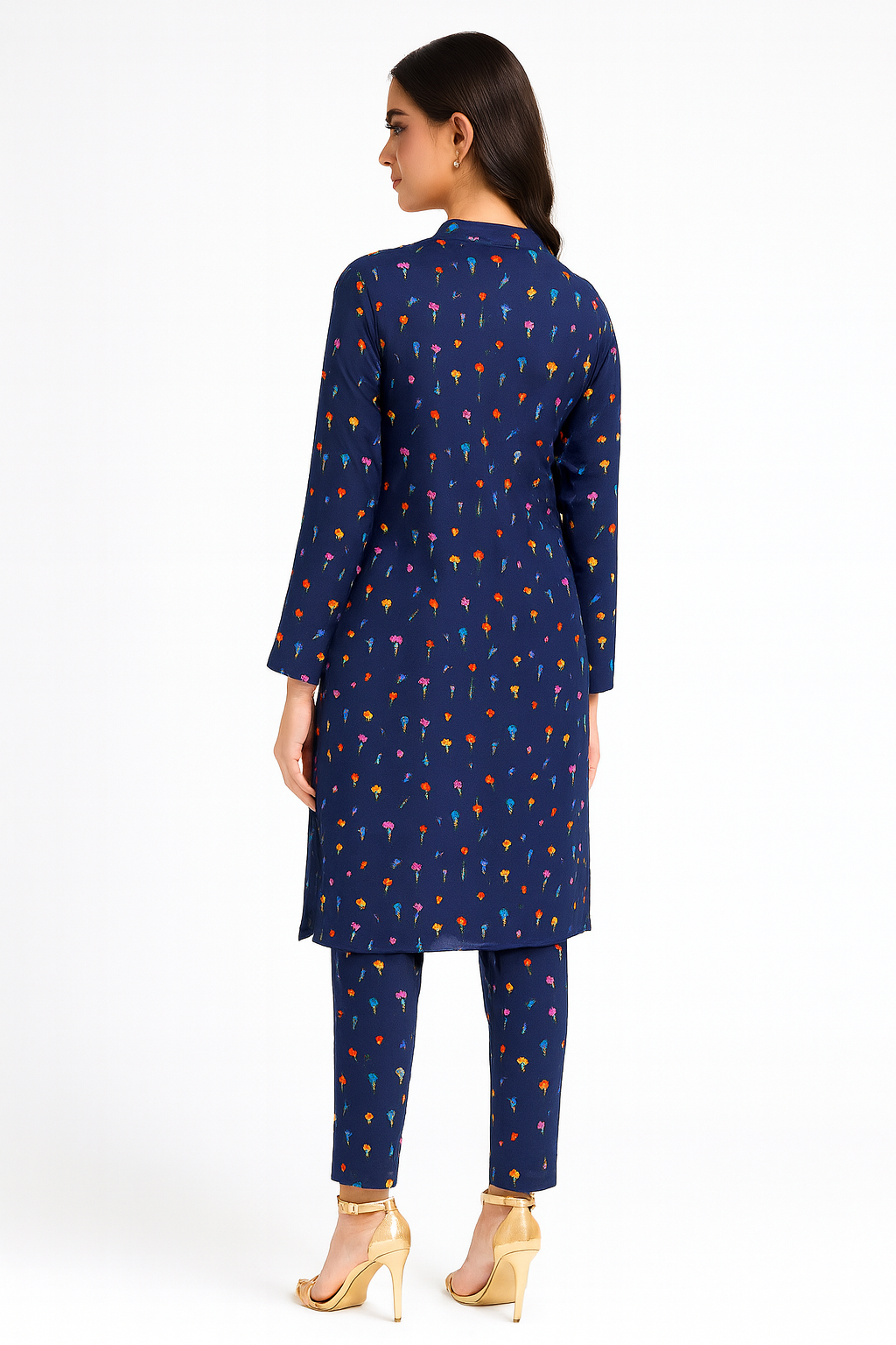 Elevate your everyday look with this effortlessly chic two-piece lawn suit, crafted in a deep navy base with a playful all-over floral motif. The panel-cut shirt features a clean V neckline and full sleeves, delivering a flattering silhouette that enhances your natural shape. Paired with tapered trousers for a sleek finish, this ensemble is both breathable and stylish—perfect for summer brunches, casual Fridays, or festive gatherings.