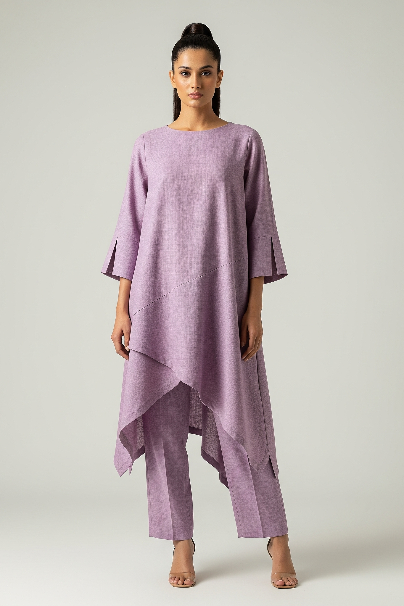 Embrace a new era of workwear with our Asymmetrical Lilac Linen set. This two-piece ensemble redefines modern Pakistani style, blending effortless comfort with a contemporary, artistic silhouette.