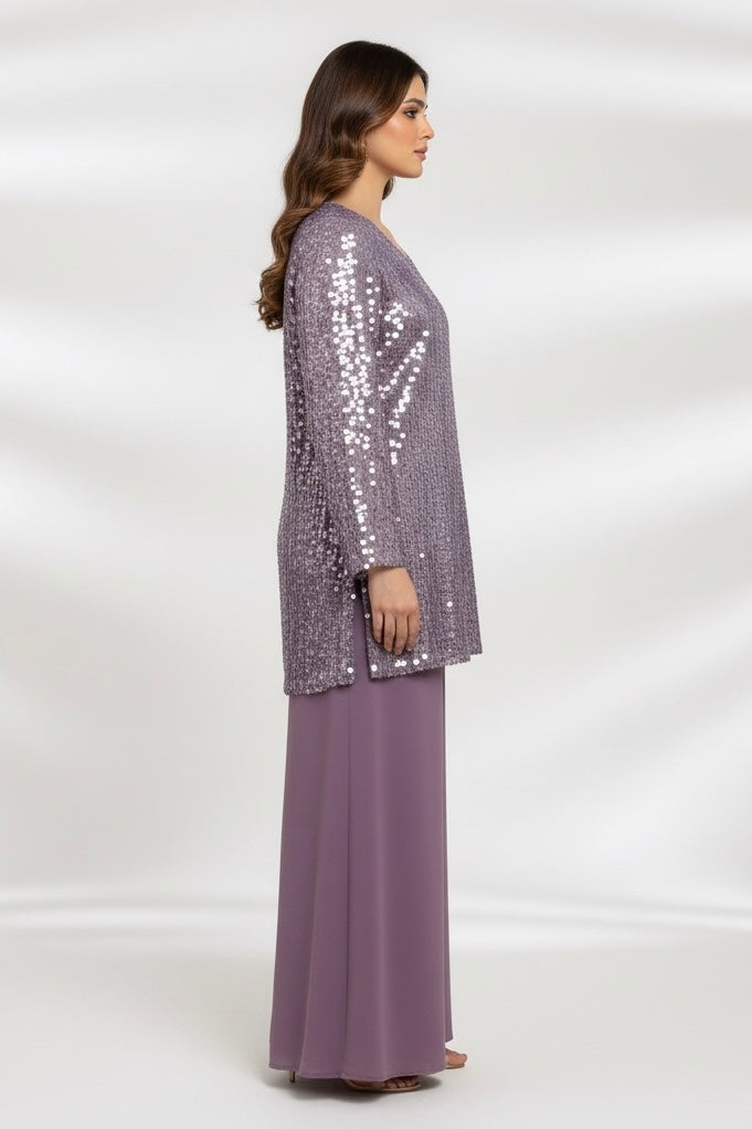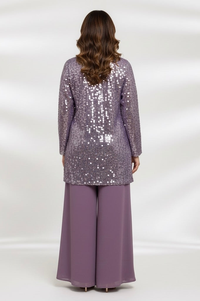 Make a statement with this elegant lilac coord set, featuring a fully embellished sequin top paired with luxurious velvet wide-leg trousers. Designed for festive nights and special occasions, this outfit blends sparkle, sophistication, and comfort.