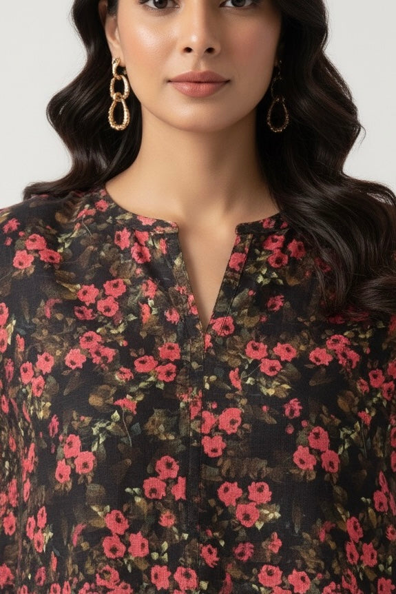 Step into effortless elegance with this beautifully printed self linen coord set, designed for both comfort and chic everyday style. The outfit features a soft self-textured linen base adorned with an all-over floral print in deep red and rose tones against a dark background — perfect for day-to-evening wear.