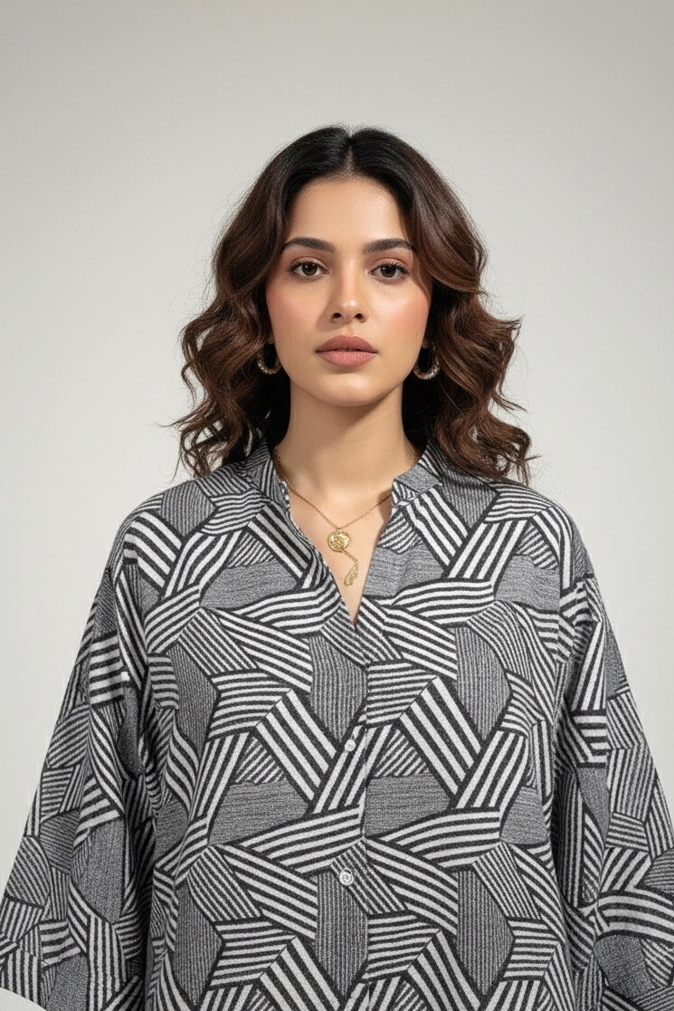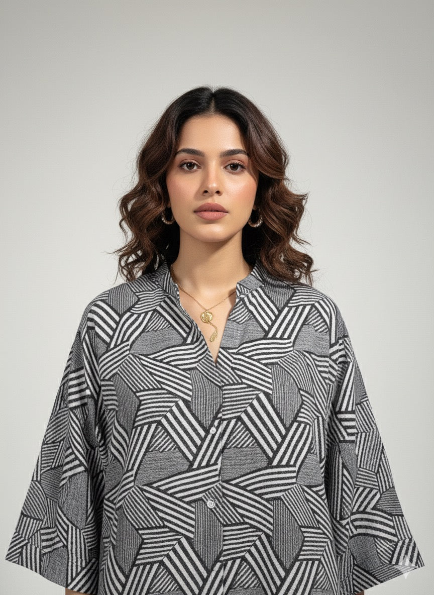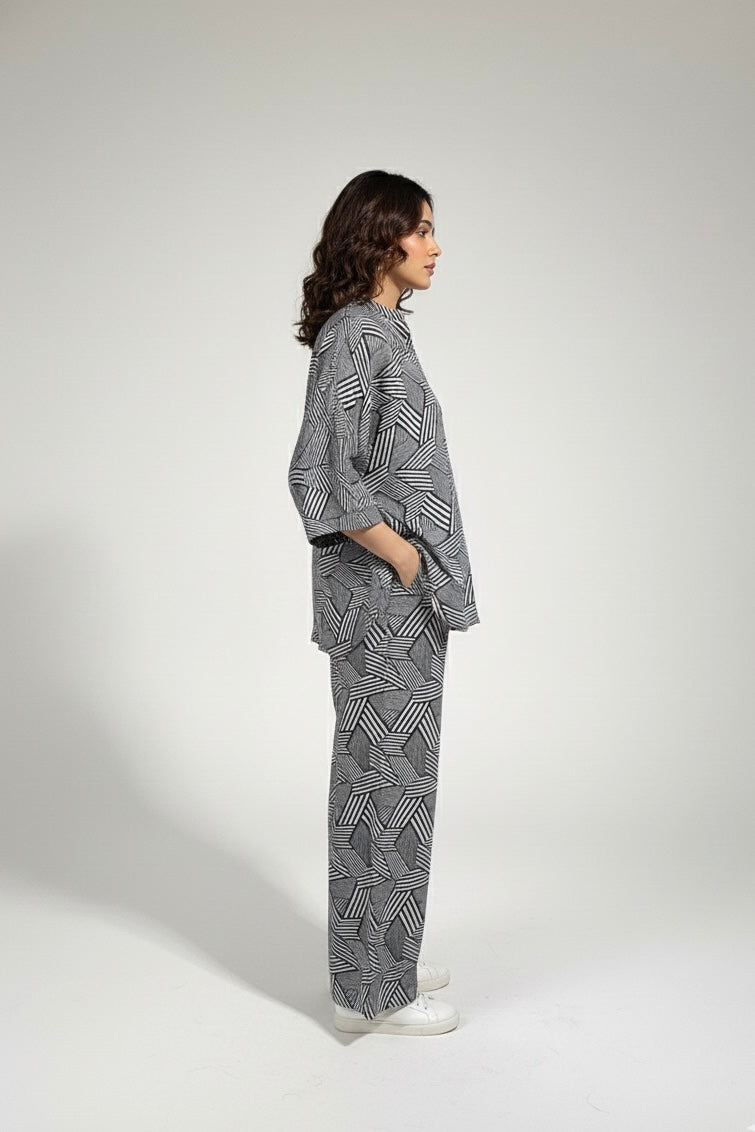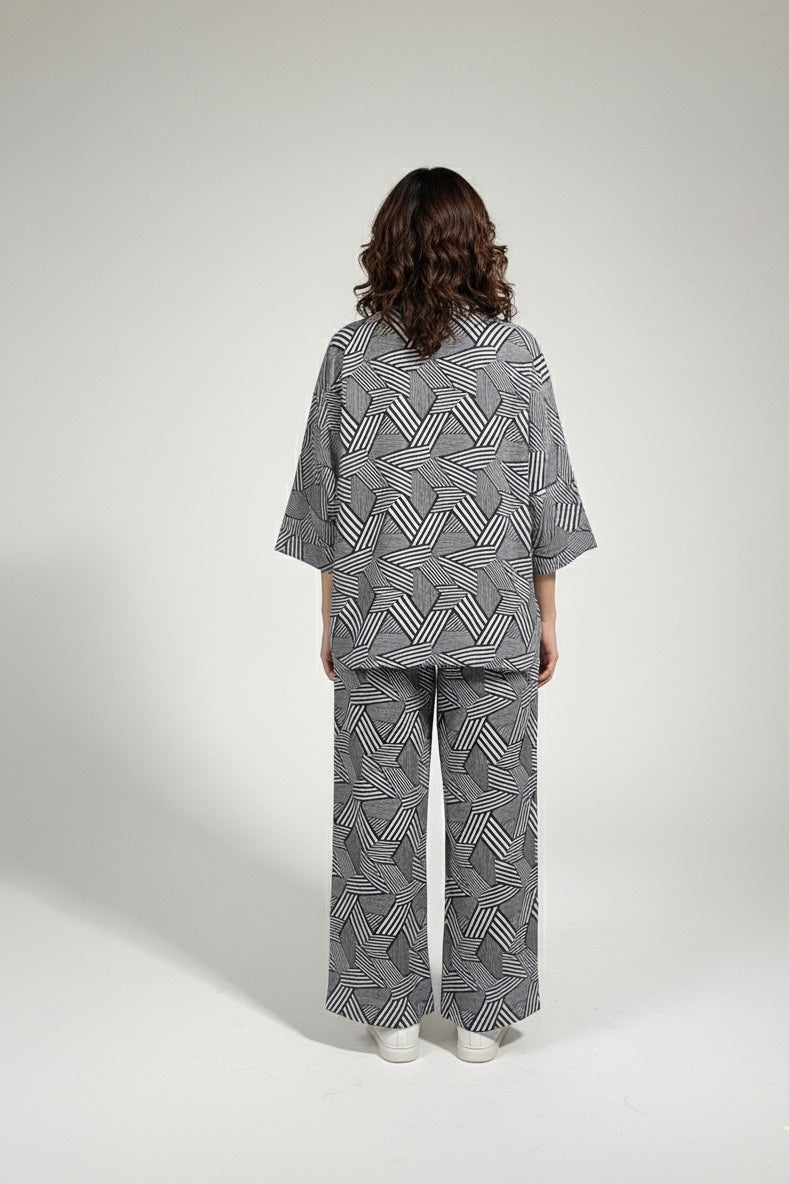 Elevate your everyday look with this contemporary monochrome co-ord set featuring a striking geometric maze print. The relaxed silhouette includes a straight-cut shirt with a V-neckline and roomy half sleeves, paired with wide-leg trousers that balance comfort and style effortlessly. Crafted from breathable blended linen, this set offers a smooth drape and all-day ease — perfect for casual days, travel, or elevated loungewear.