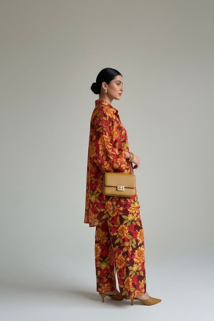 Step into the season with confidence in this amber-toned floral coord set crafted from premium self-weave linen. Designed for both elegance and comfort, it features a relaxed, longline button-down shirt paired with wide-leg trousers, creating a chic, effortless silhouette.