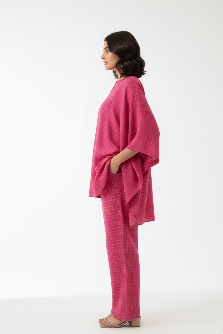 Step into effortless elegance with this two-piece pink grid marina co-ord set, designed for comfort and understated charm. The loose-fit top features a stylish V-slit neckline, wide sleeves, and a flowy silhouette that drapes beautifully. Paired with straight trousers crafted in the same soft grid-textured marina fabric, this set ensures both comfort and sophistication — perfect for cozy winter days or casual gatherings.