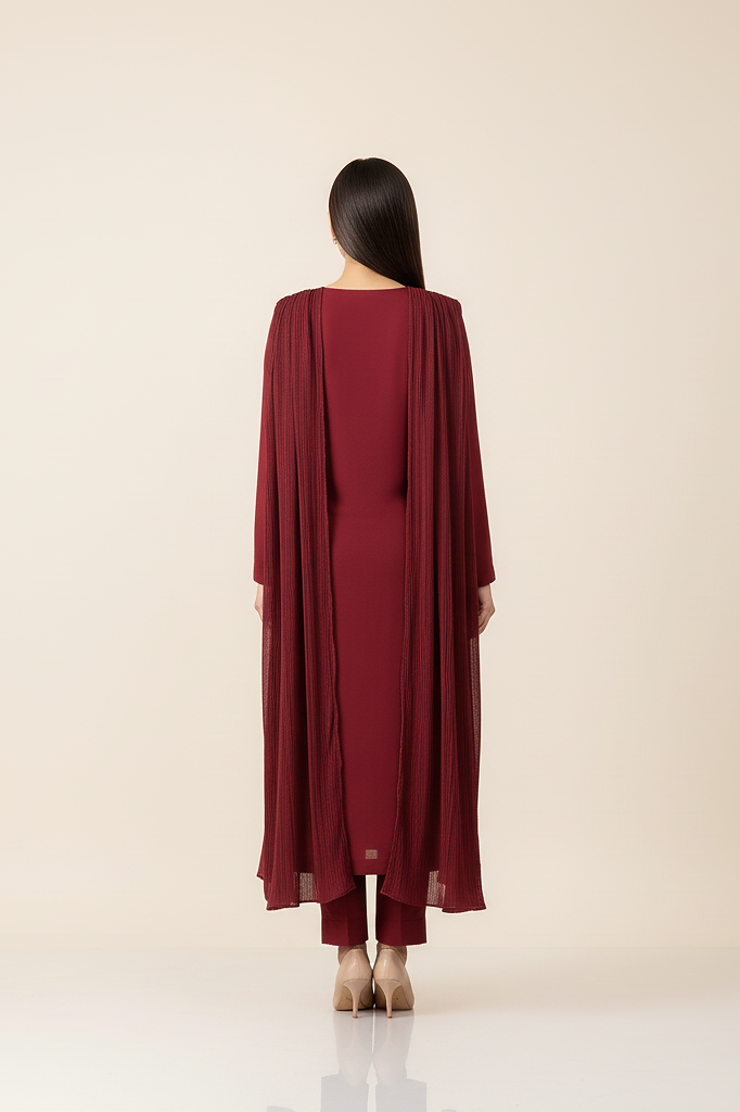 Elevate your style with this exquisitely designed 3-piece suit, crafted from premium karandi fabric. The rich maroon hue and textured feel of the fabric offer a sophisticated look, perfect for any occasion.