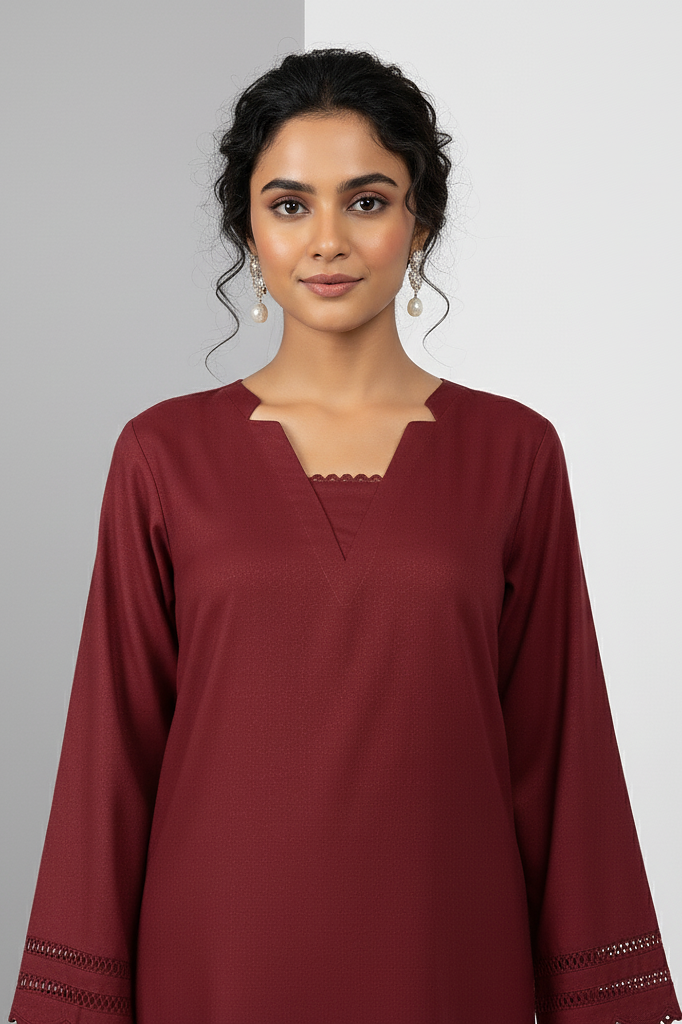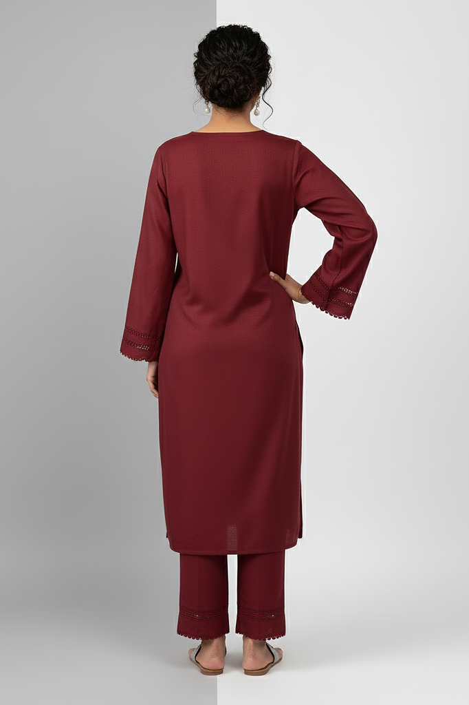 This maroon two-piece set is crafted from soft winter karandi fabric, offering a cozy yet elegant feel for the colder months. The kurta features a notch neckline with subtle lace detailing on the sleeves and hem, adding a feminine touch to the minimal silhouette. The straight-cut shirt pairs effortlessly with matching trousers, detailed with lace trims for a coordinated and refined look.