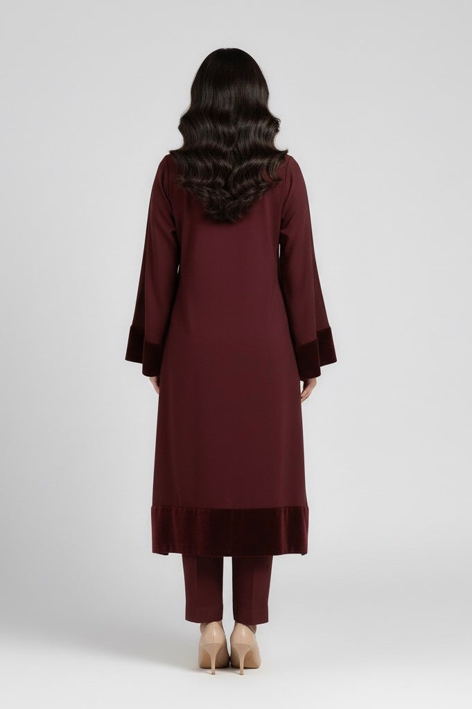 Step into effortless elegance with our Karandi Chic - Maroon Velvet Accent Coord Set. Designed for the modern Pakistani woman, this stylish and comfortable ensemble perfectly blends traditional fabric with contemporary design for a slightly shorter, on-trend silhouette.