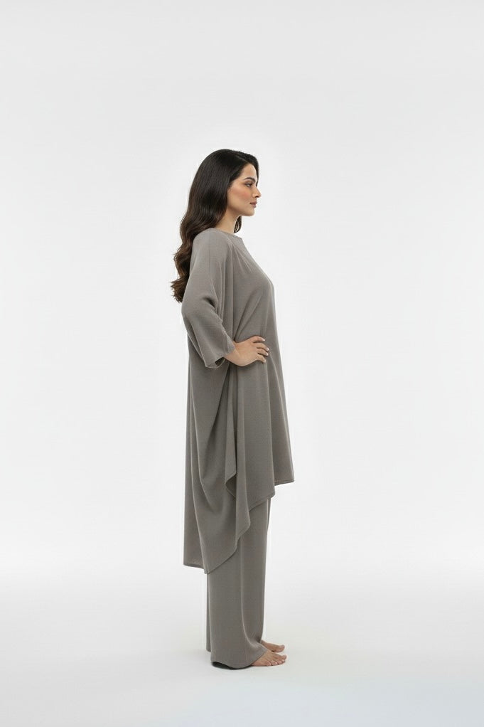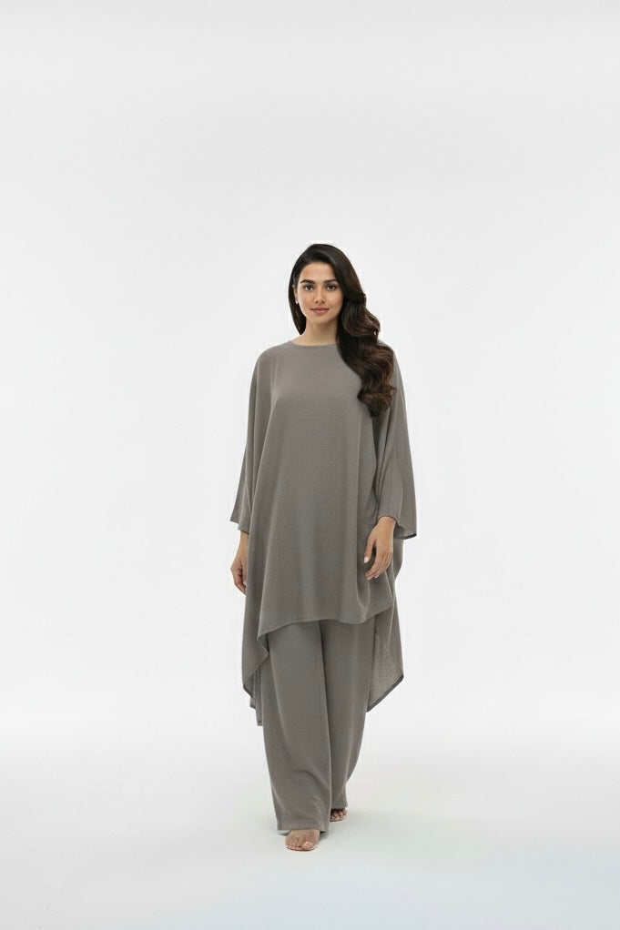 A refined, flowy coord set crafted in luxurious peach wool, offering a soft touch, elegant fall, and all-day comfort. The asymmetrical kaftan-style top paired with wide-leg trousers creates an effortlessly graceful silhouette perfect for winter outings.