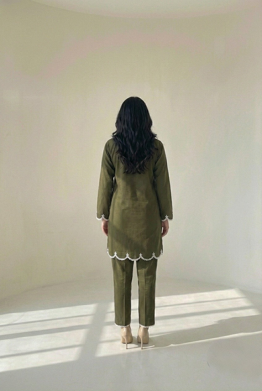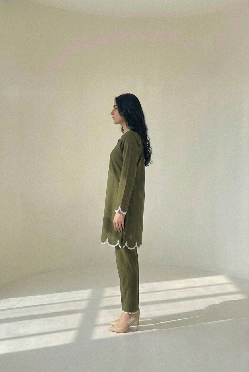 Olive Cambric Lawn Embellished Set