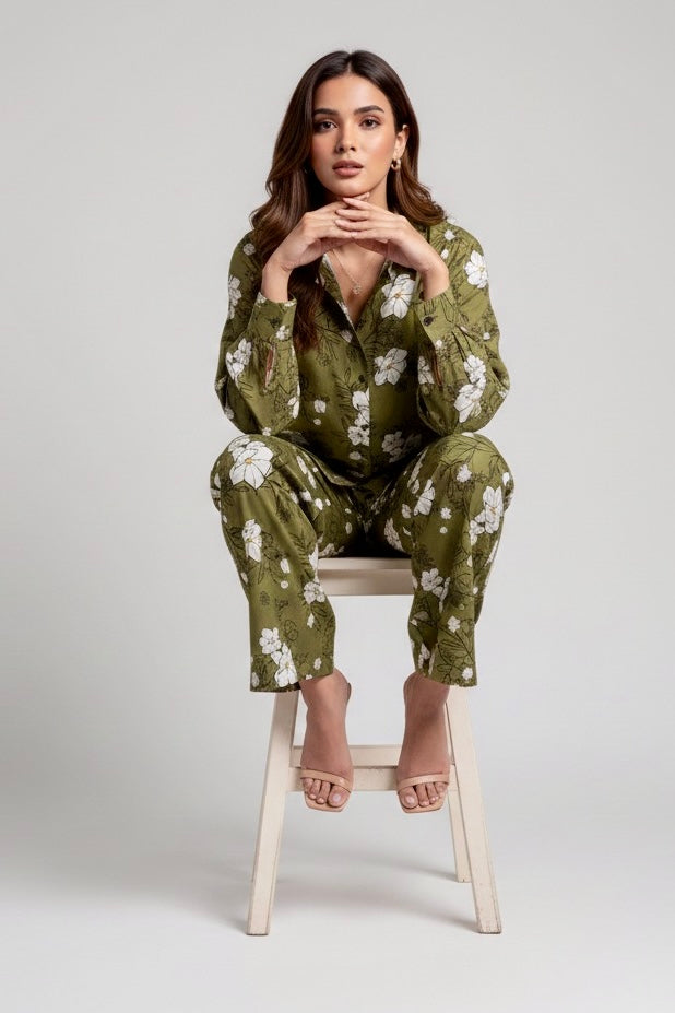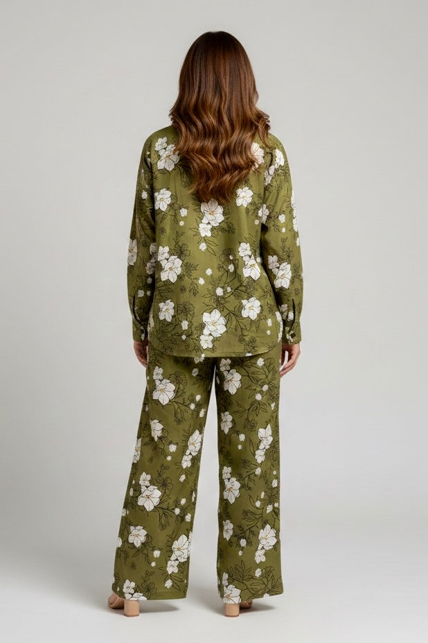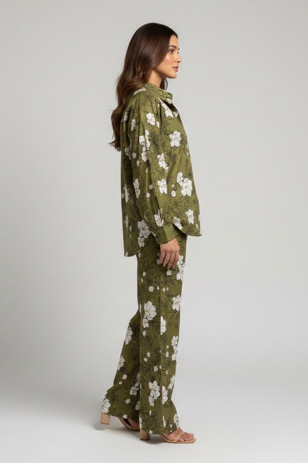 A refined two-piece ensemble crafted from breathable printed lawn, featuring a soft floral print in a rich earthy tone. The relaxed shirt is designed with a classic collar and front button placket, paired with wide-leg trousers for an effortlessly polished silhouette.