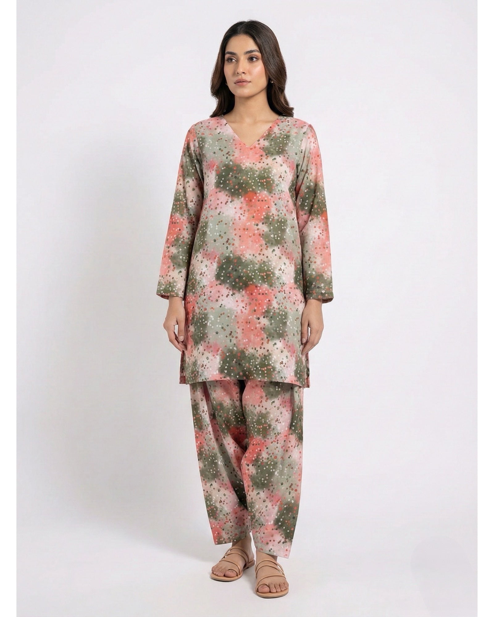 A modern, easygoing two-piece crafted from breathable lawn, designed for effortless summer styling. The straight-cut shirt features a flattering V-neckline and full sleeves, paired with matching straight trousers for a relaxed yet polished look. Soft abstract prints add a contemporary touch while keeping the outfit light and comfortable.