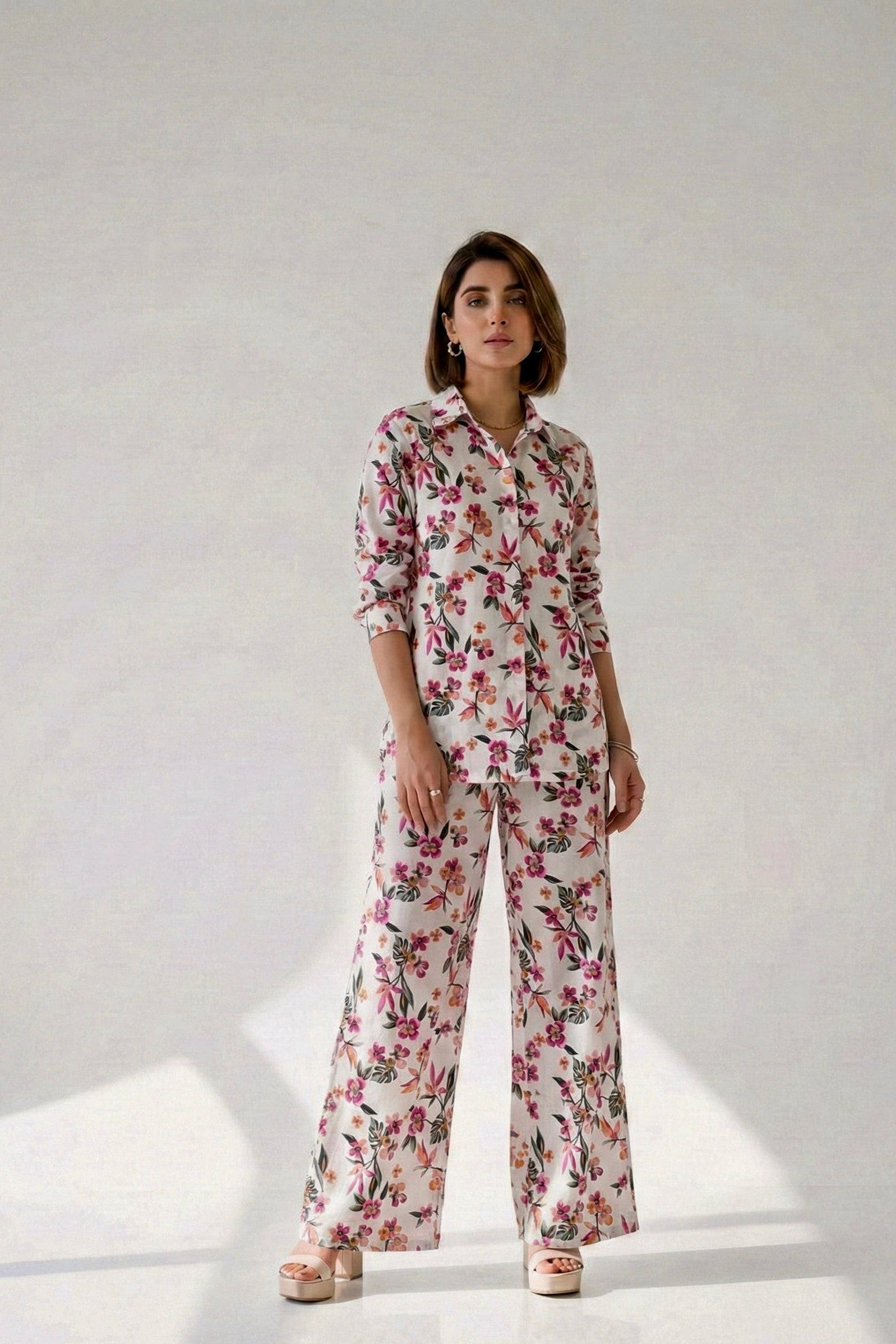 A breezy, effortlessly chic co-ord set crafted from premium lawn fabric, perfect for warm days and everyday elegance. Featuring a classic button-down shirt adorned with a delicate floral print, paired with matching wide-leg trousers for a relaxed yet polished silhouette. Lightweight, breathable, and easy to style — this set is your go-to for comfort with a refined finish.