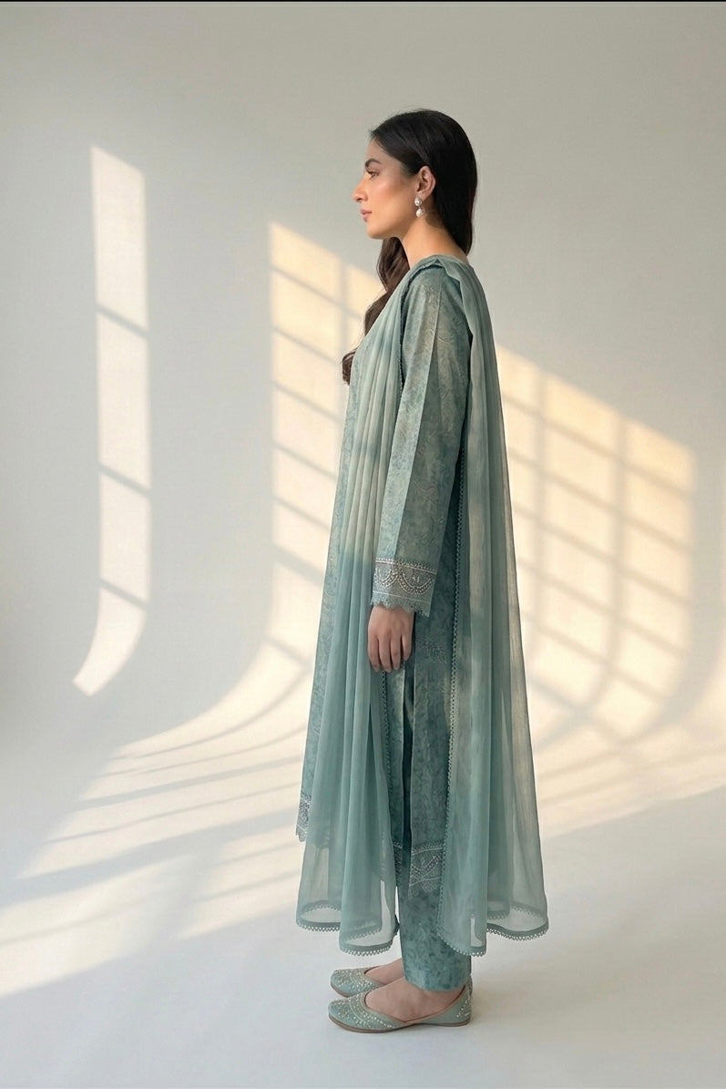 A timeless blend of grace and simplicity. This beautiful sage green lawn outfit features delicate tonal prints with subtle embroidery details on the neckline and sleeves, creating a refined and sophisticated look. Perfect for summer days, this outfit offers both comfort and effortless elegance.