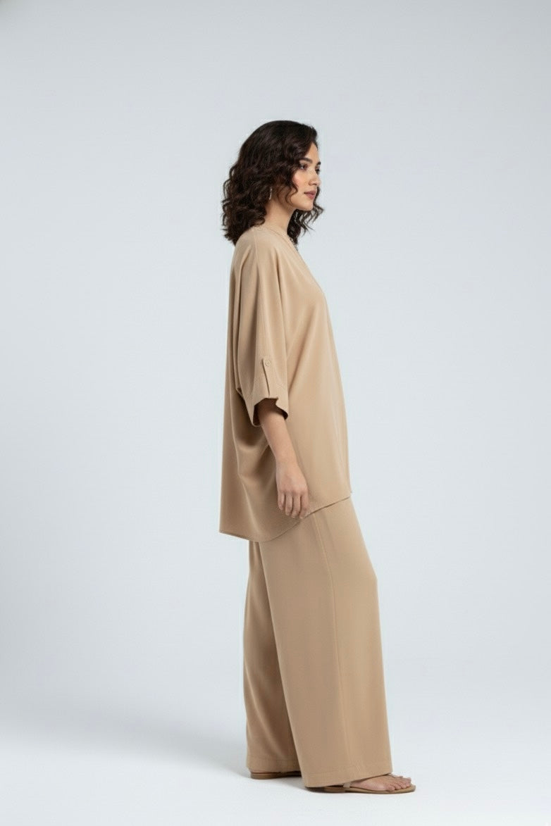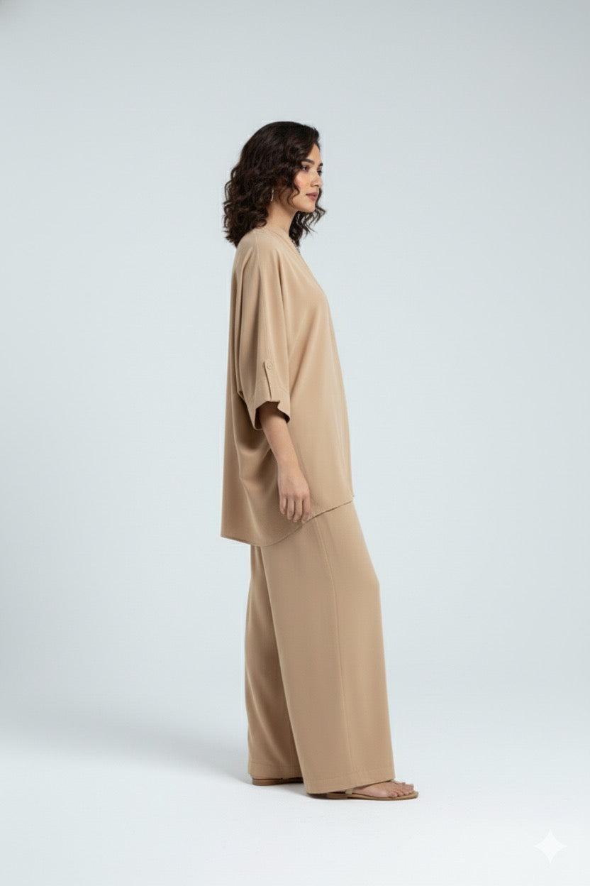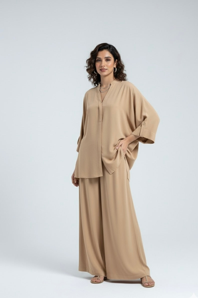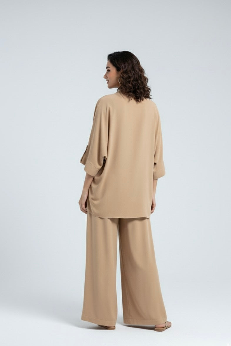Effortless style meets all-day comfort in this chic white co-ord set. Crafted from premium blend fabric, the ensemble features a relaxed-fit top with a sleek V-neckline and wide sleeves for a breezy, modern look. Paired with flowy wide-leg trousers, it offers both versatility and elegance – perfect for casual outings, workdays, or travel.