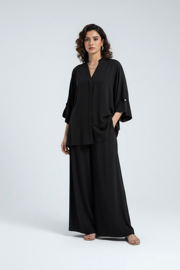 Effortless style meets all-day comfort in this chic black co-ord set. Crafted from premium blend fabric, the ensemble features a relaxed-fit top with a sleek V-neckline and wide sleeves for a breezy, modern look. Paired with flowy wide-leg trousers, it offers both versatility and elegance – perfect for casual outings, workdays, or travel.